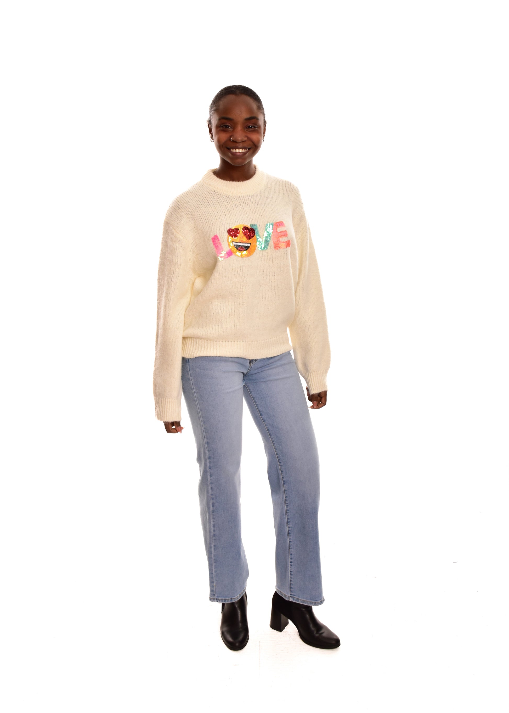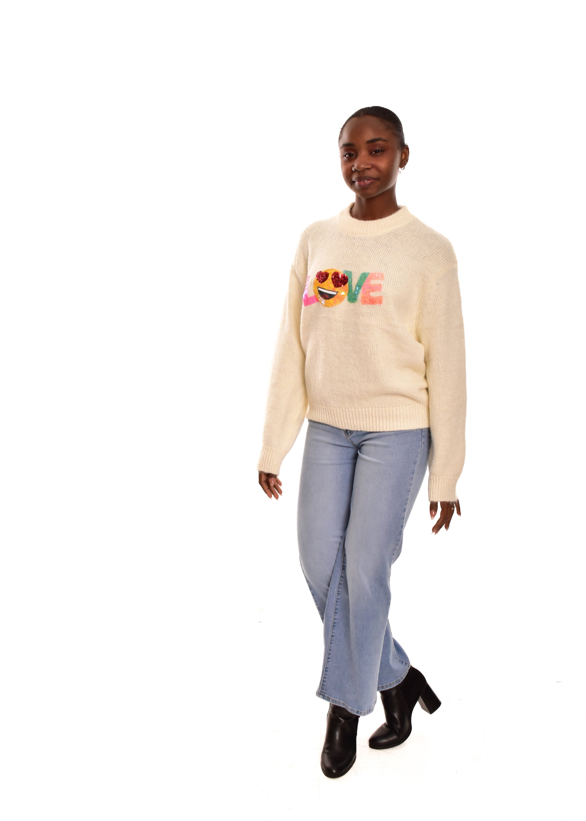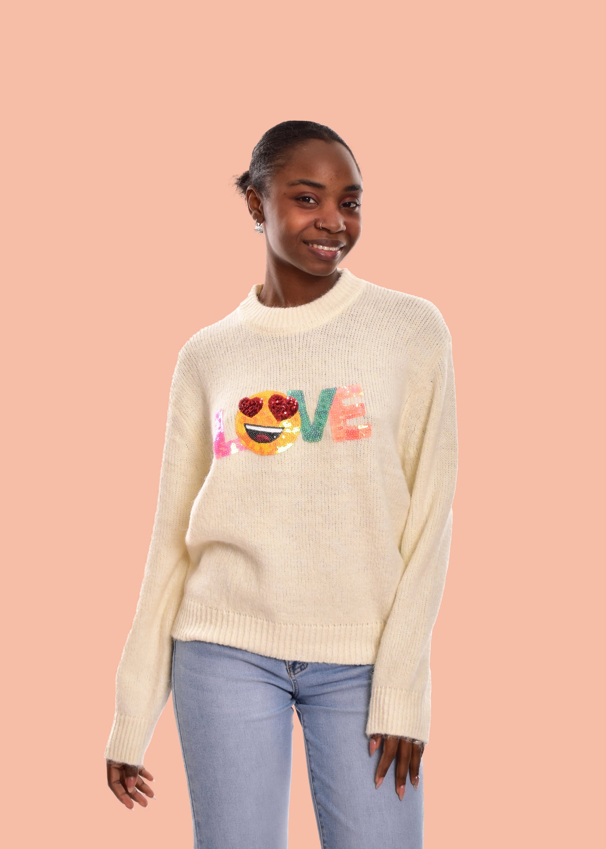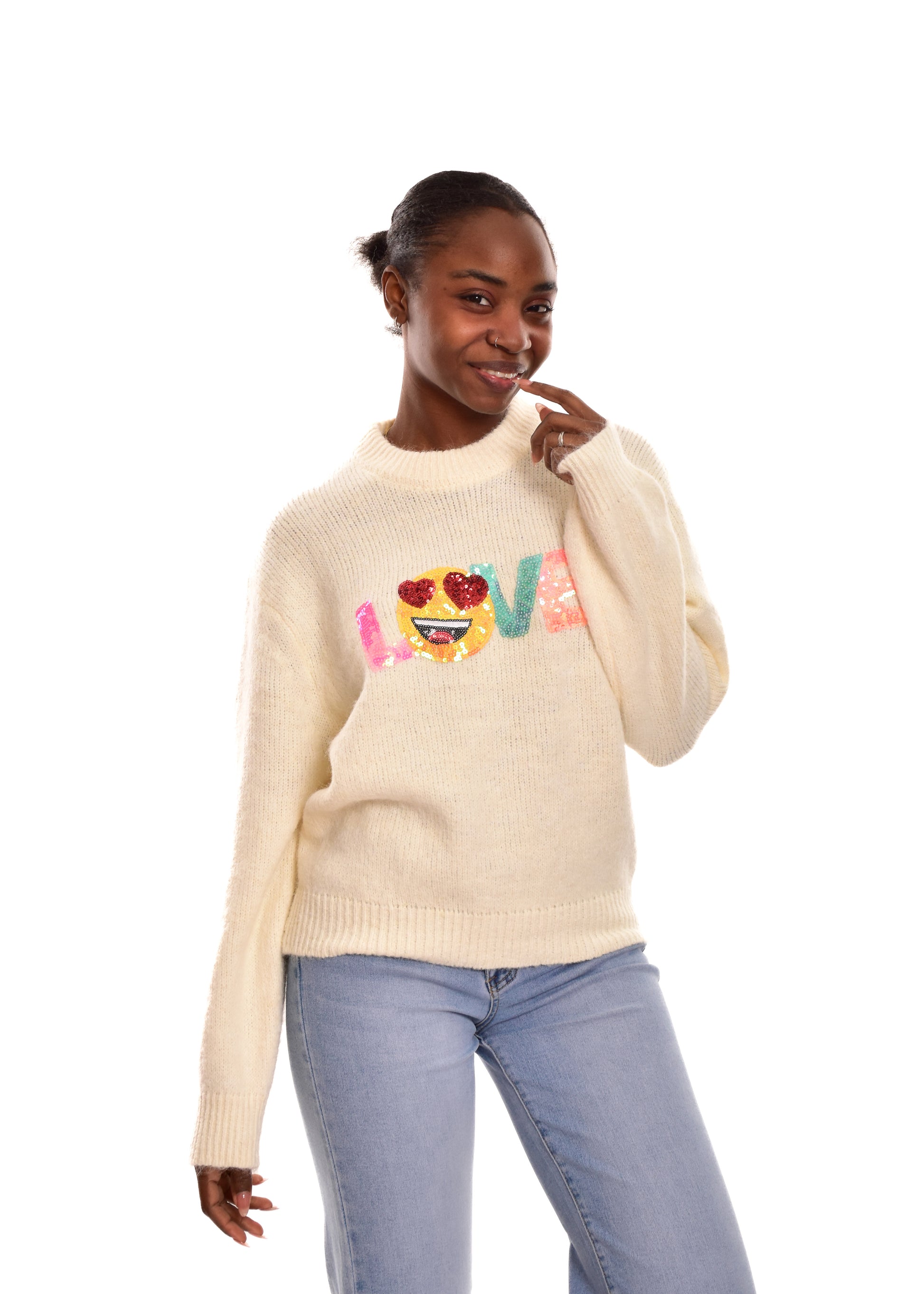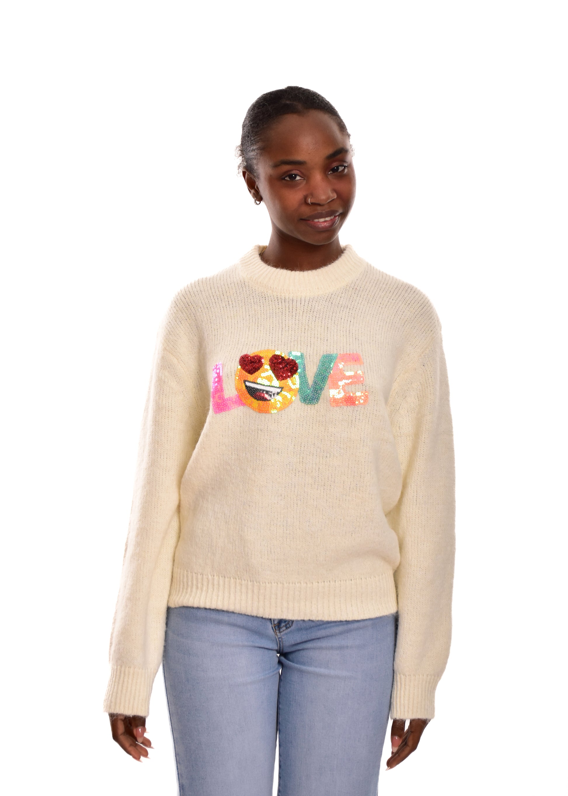 Jersey de punto grueso con parche de lentejuelas en forma de smiley. Tejido súper suave. Esta prenda está disponible en talla única, en este caso es apto hasta una talla 42.