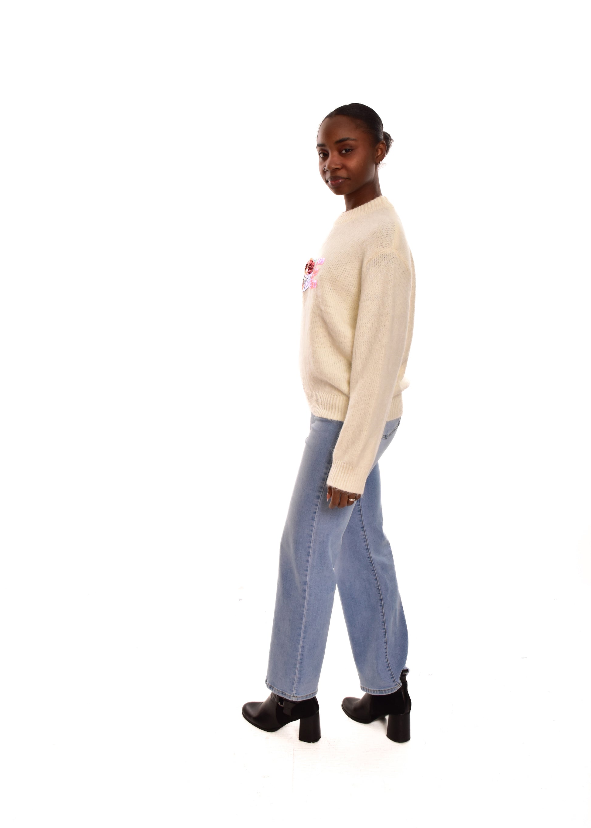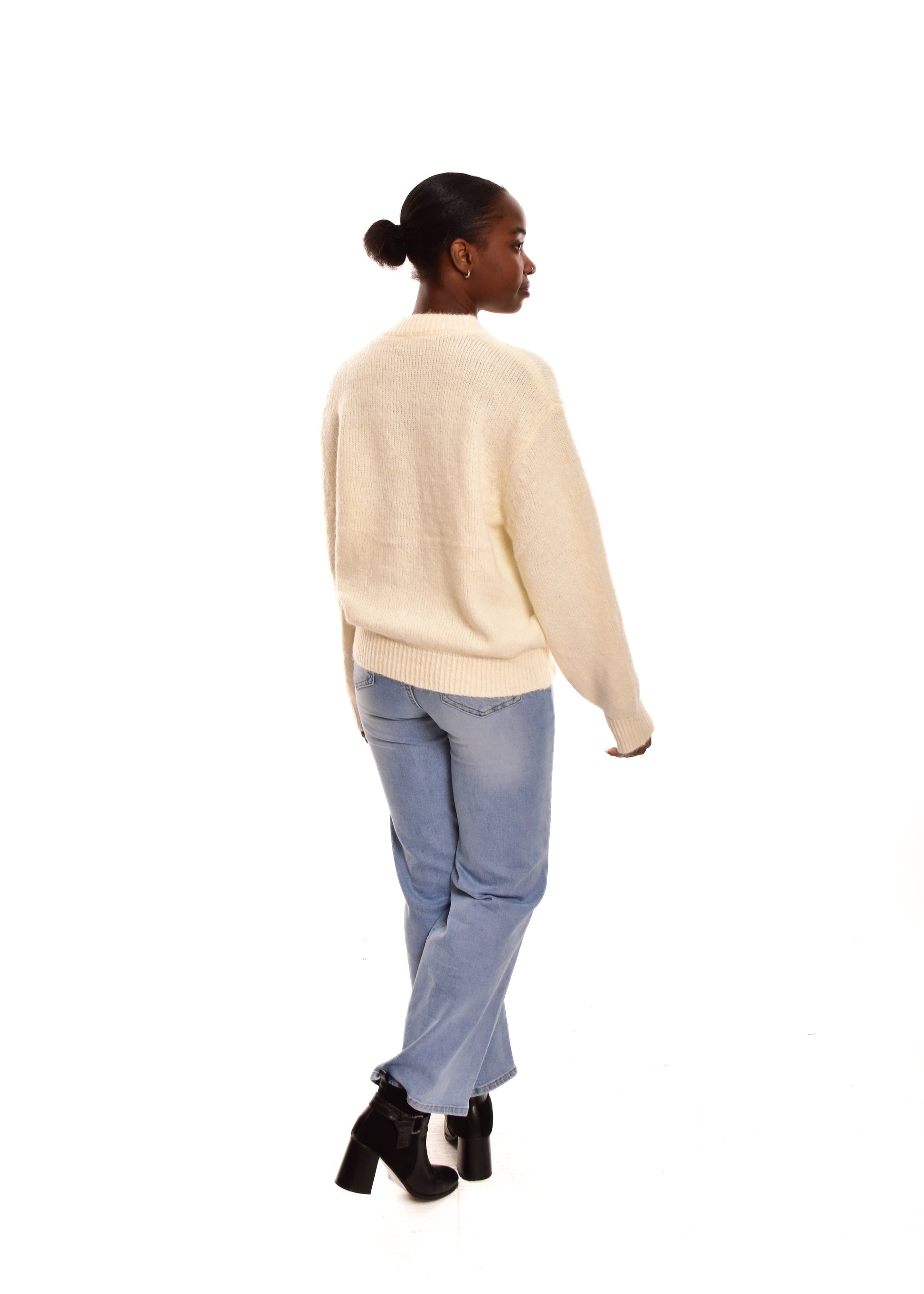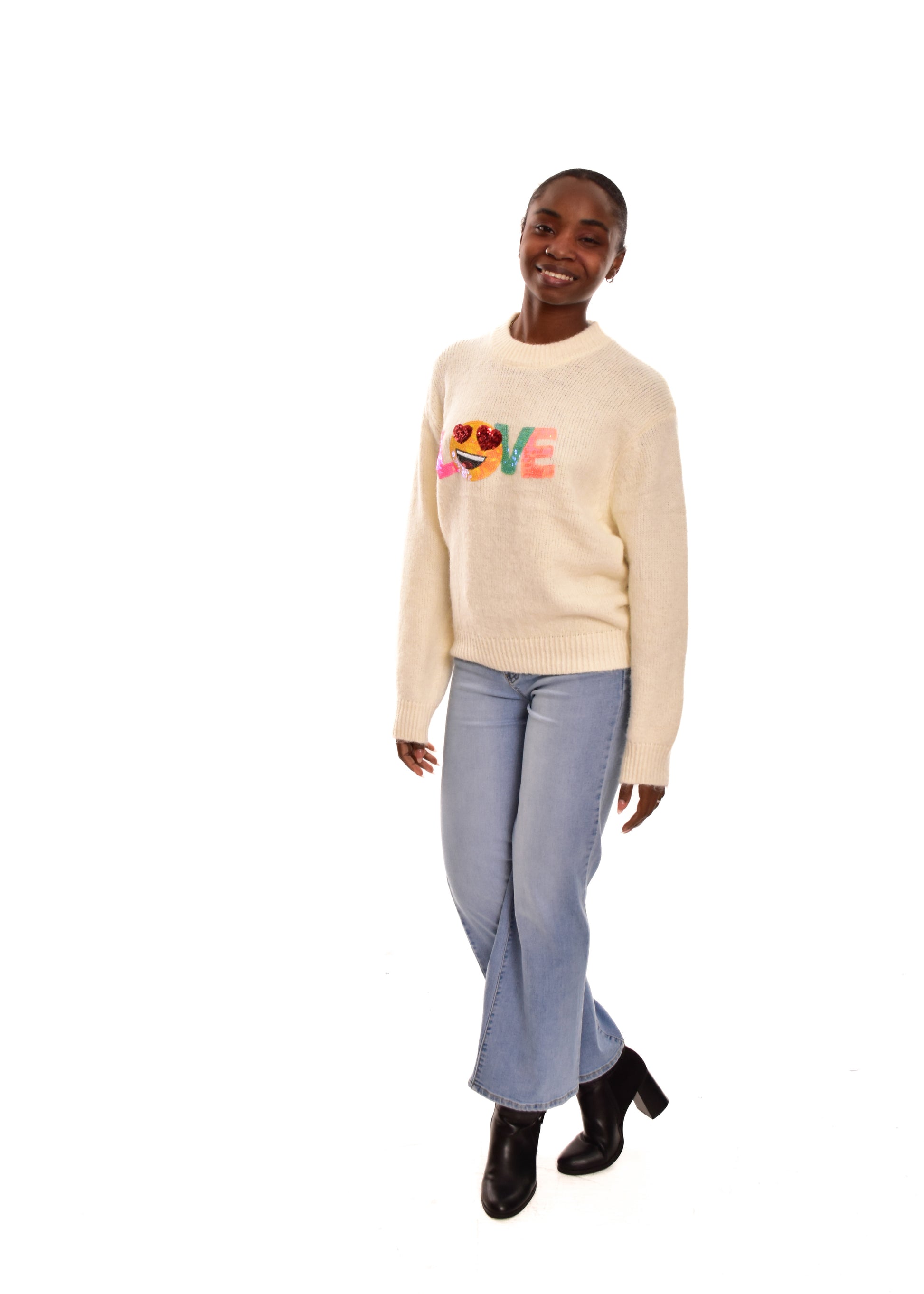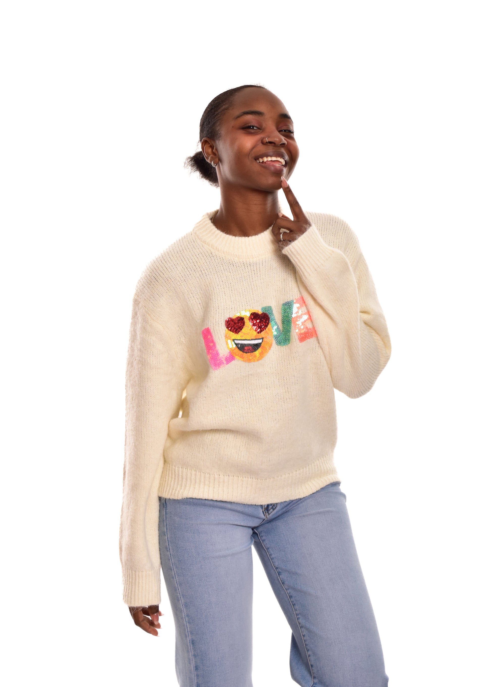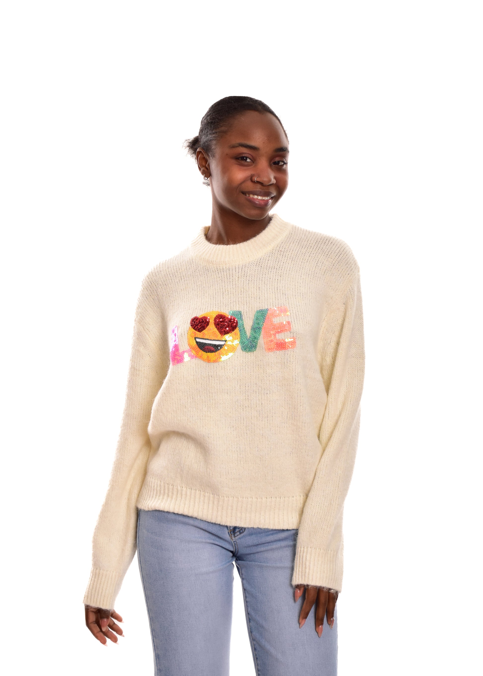 Jersey de punto grueso con parche de lentejuelas en forma de smiley. Tejido súper suave. Esta prenda está disponible en talla única, en este caso es apto hasta una talla 42.