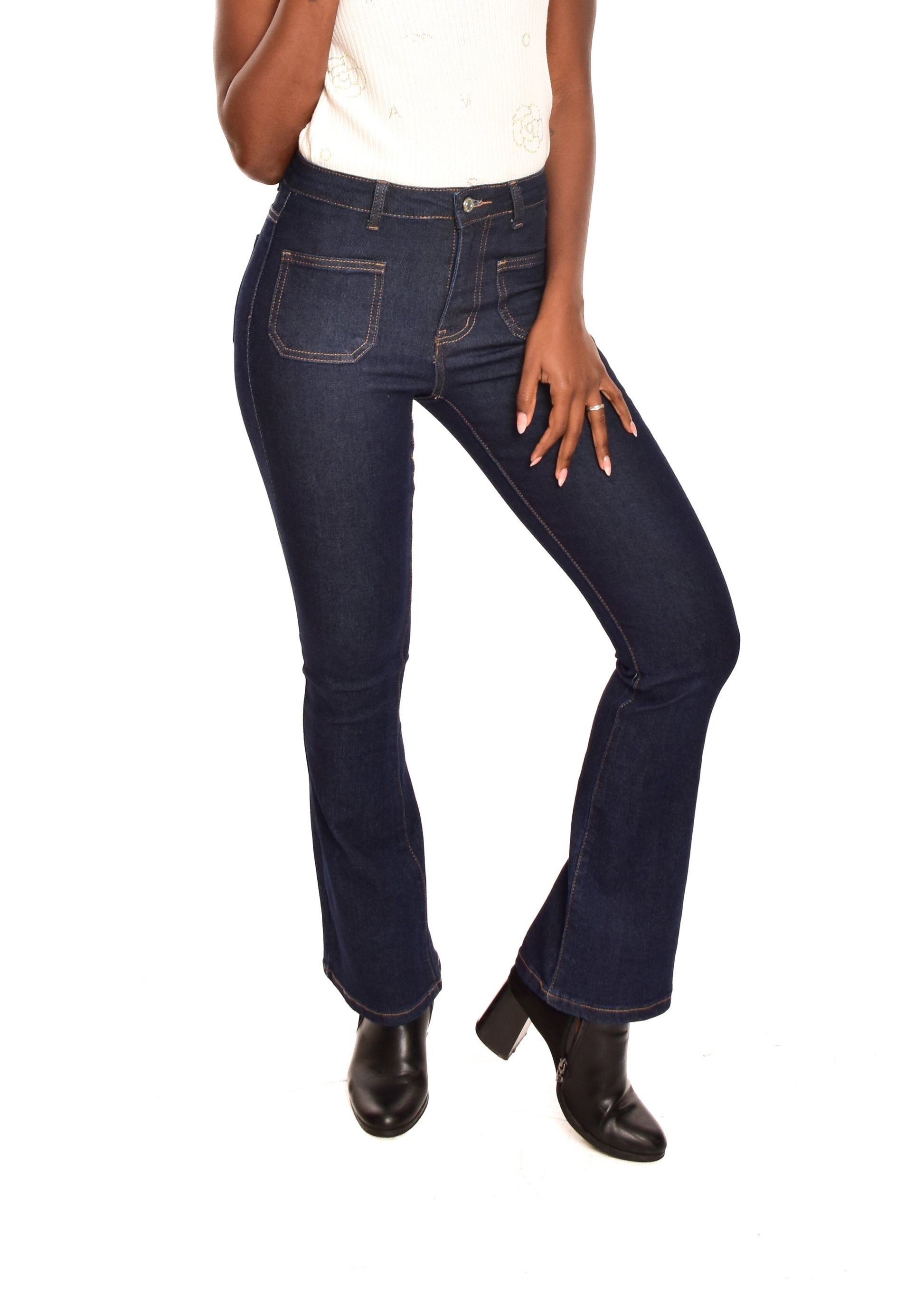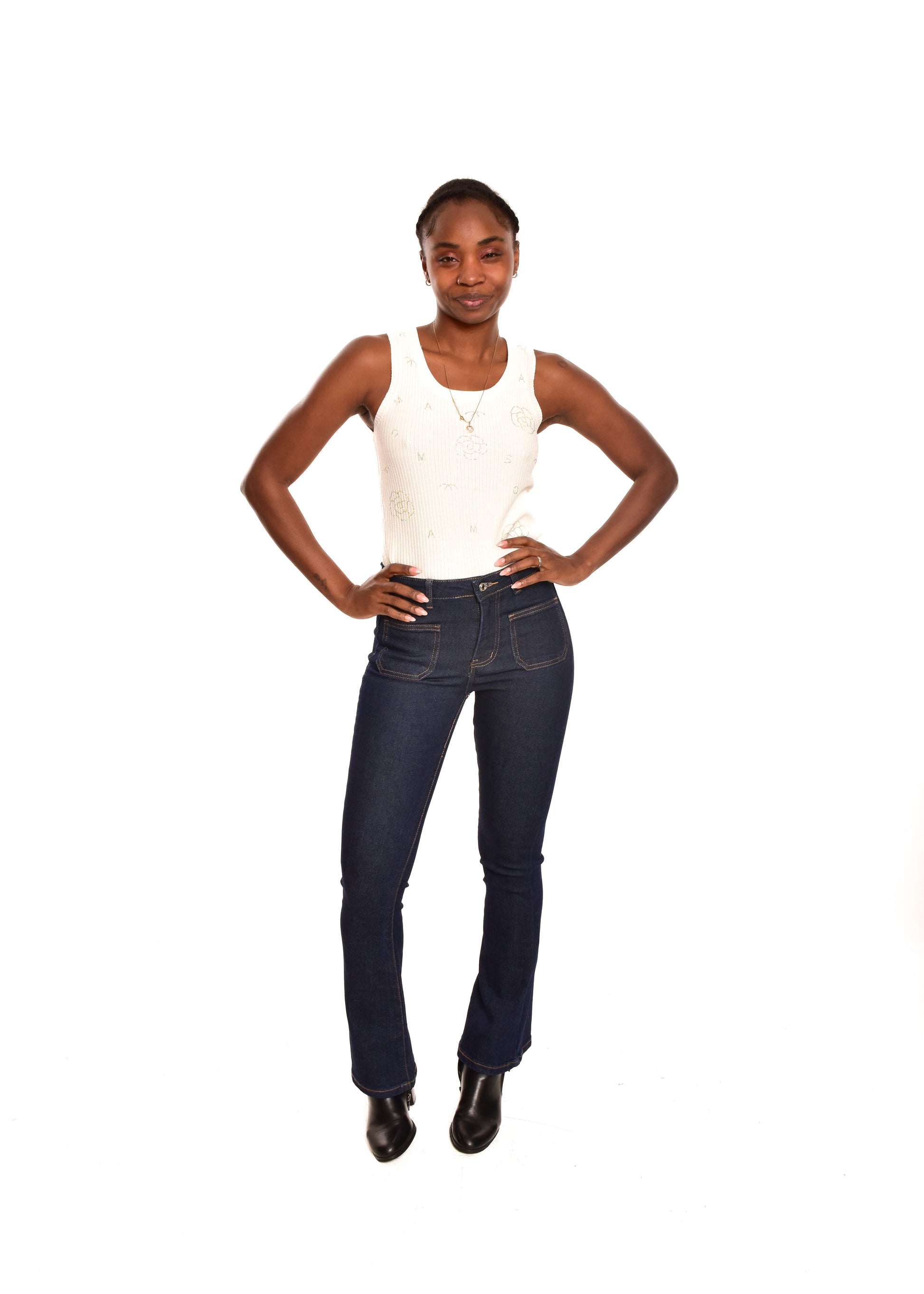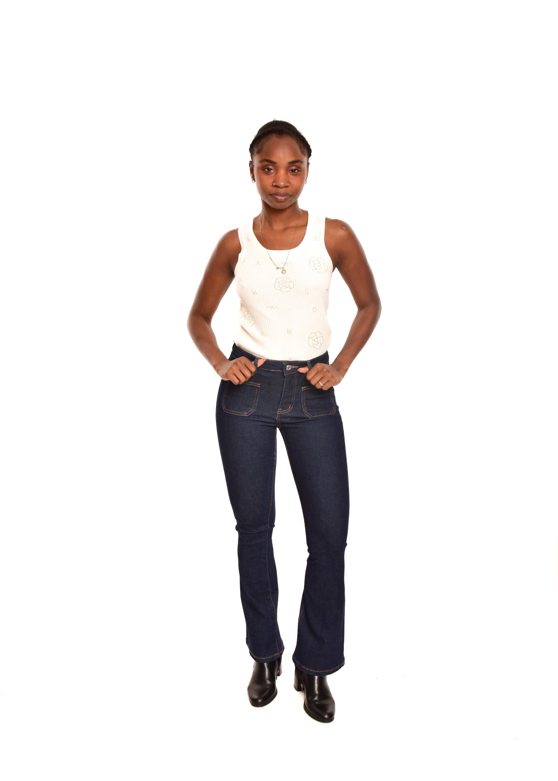 Pantalón de corte recto acampanado. Esta prenda está disponible de la talla XS a la XL , en este caso es apta hasta una talla 42. Si lo deseas puedes comprobar las medidas exactas de la prenda en el apartado " Talla y Medidas"