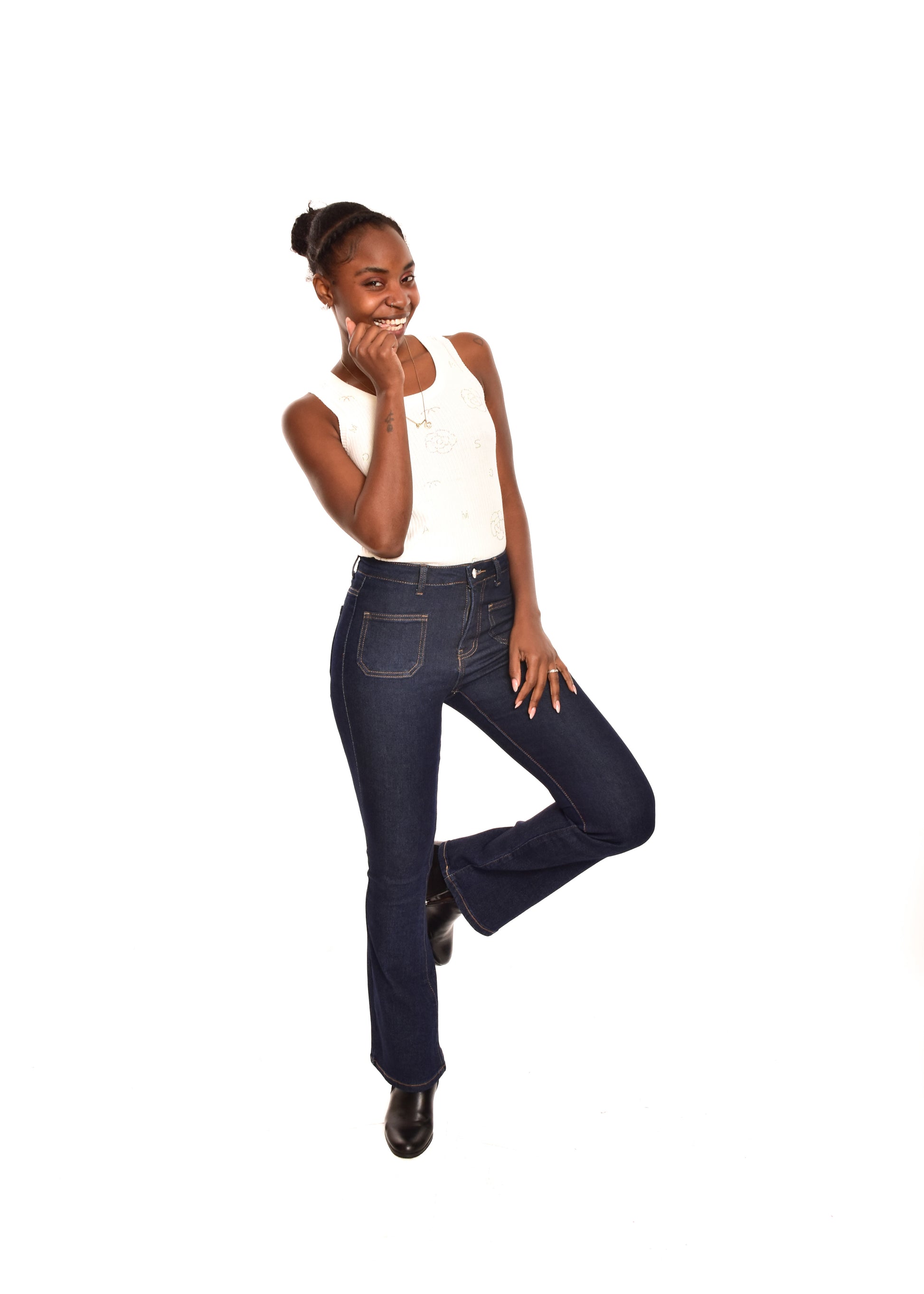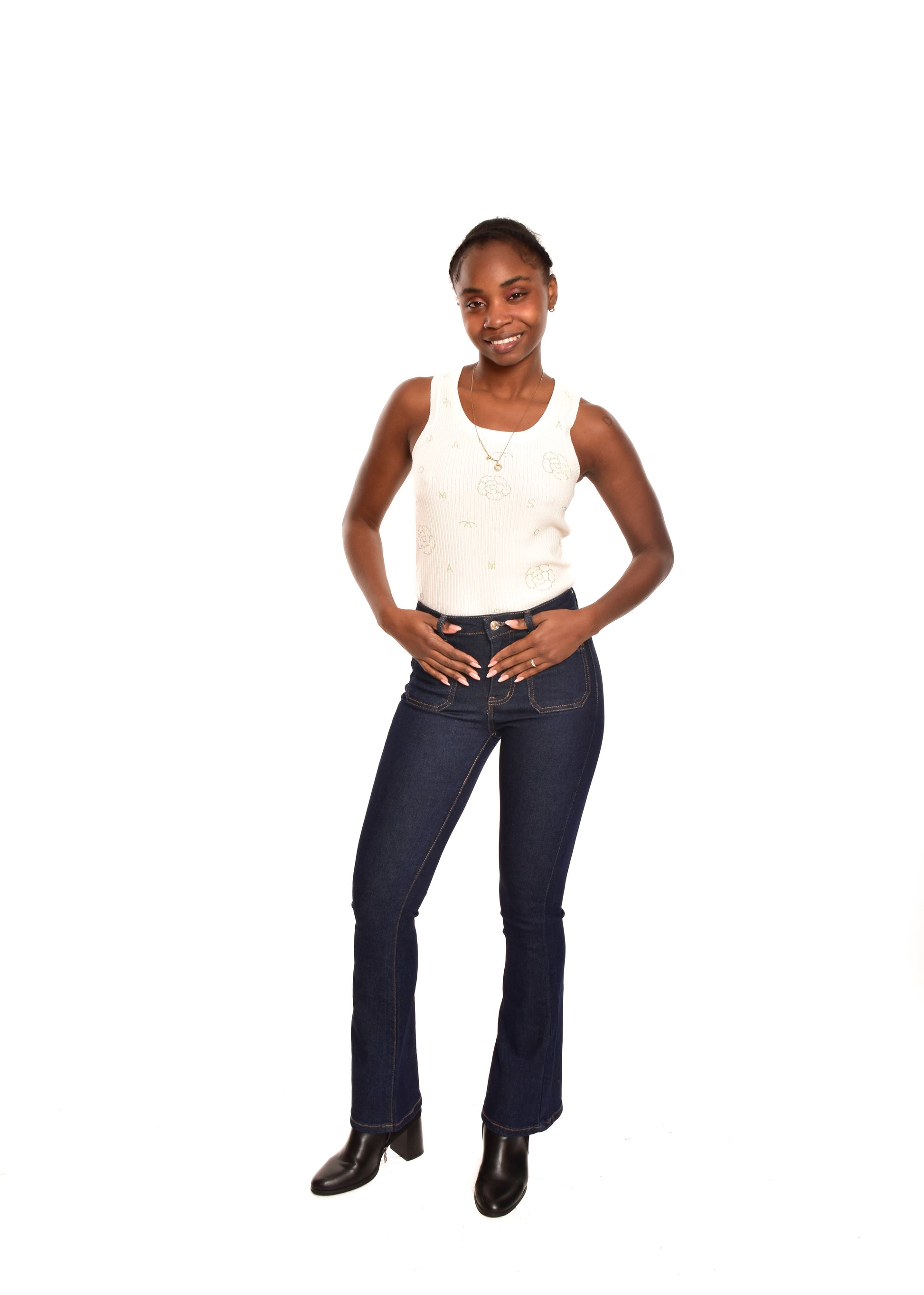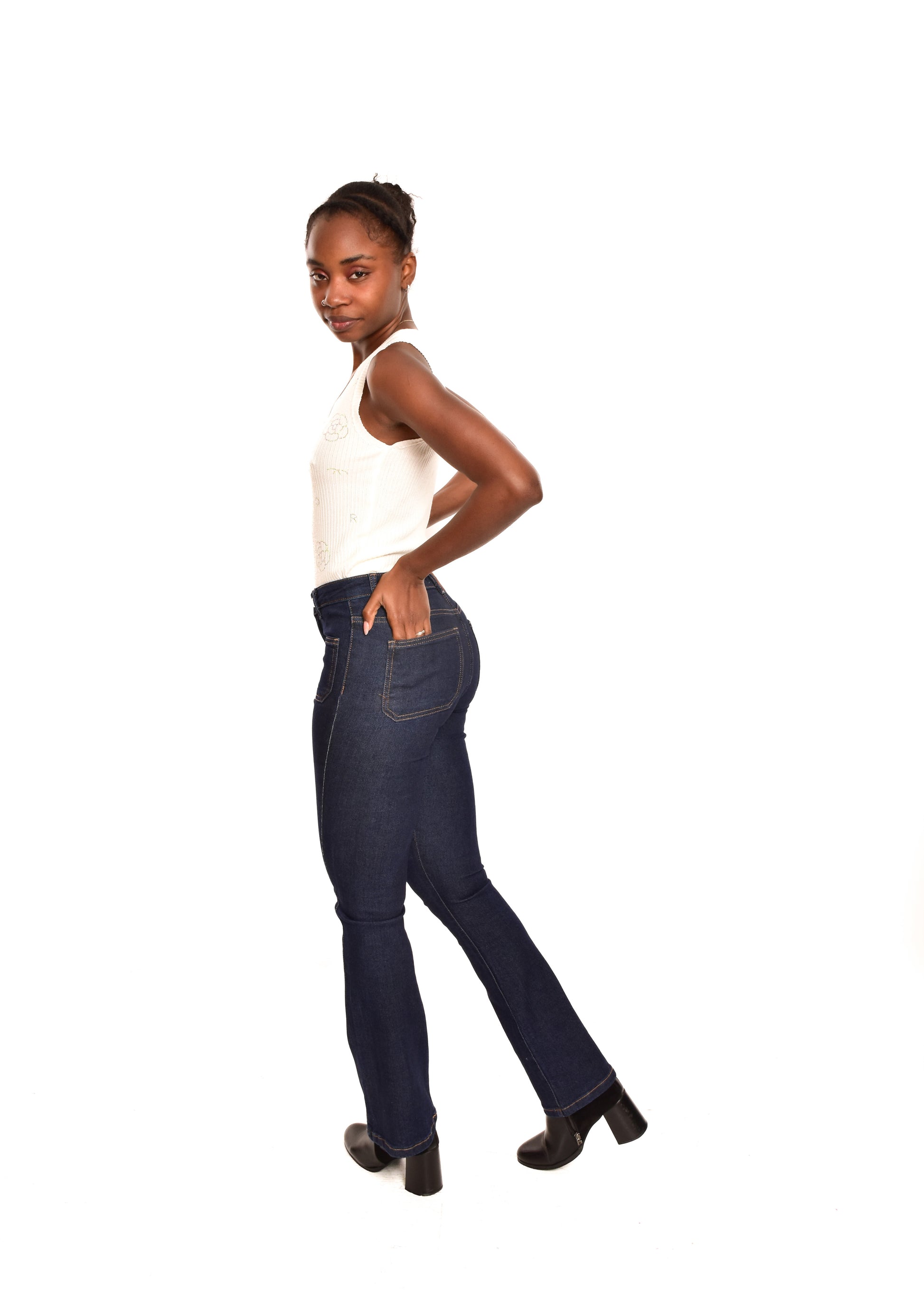 Pantalón de corte recto acampanado. Esta prenda está disponible de la talla XS a la XL , en este caso es apta hasta una talla 42. Si lo deseas puedes comprobar las medidas exactas de la prenda en el apartado " Talla y Medidas"