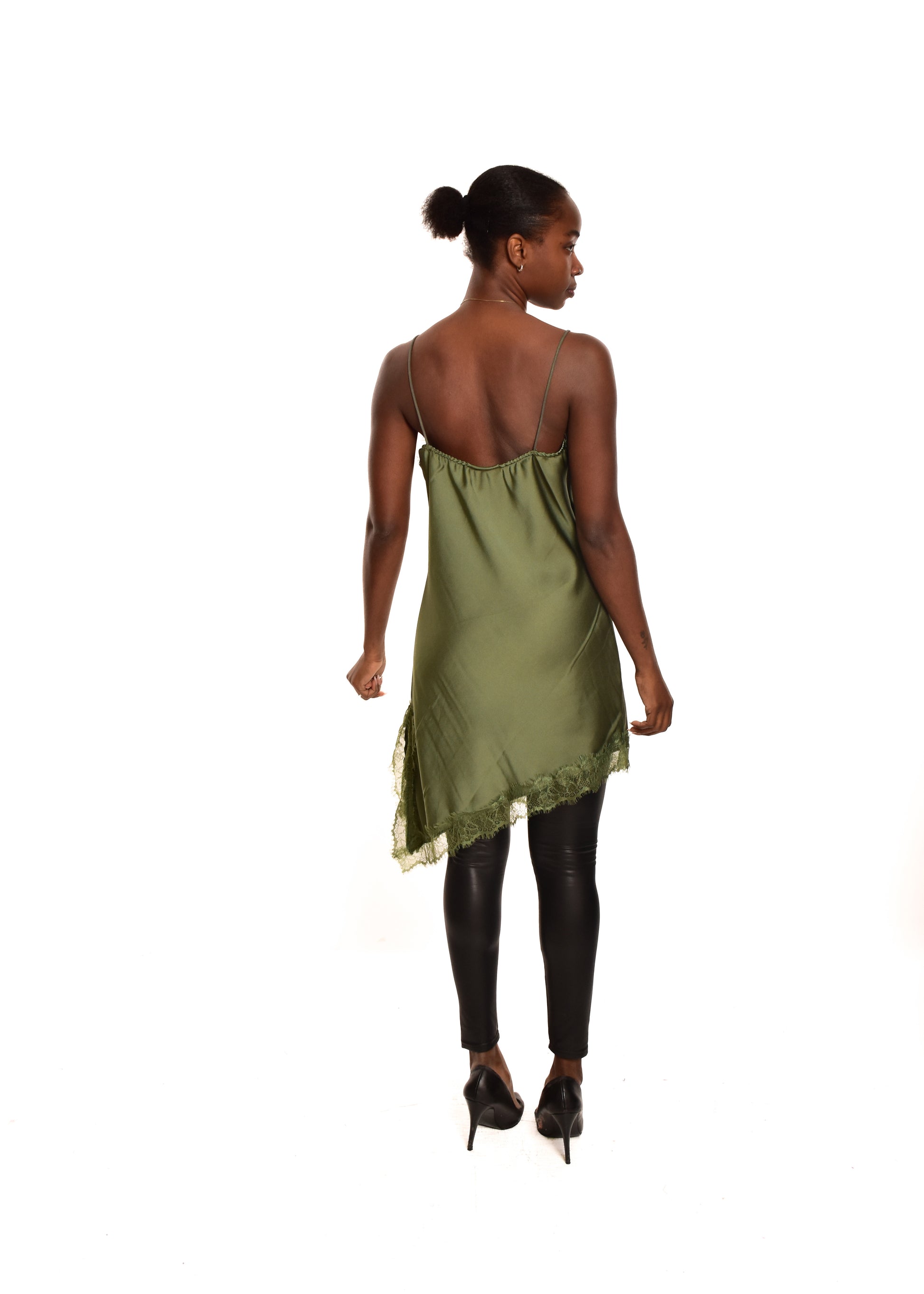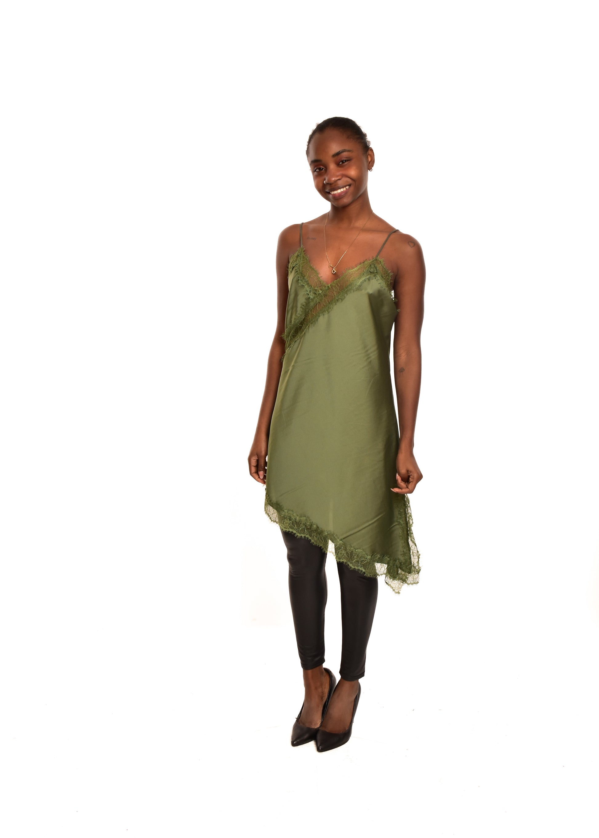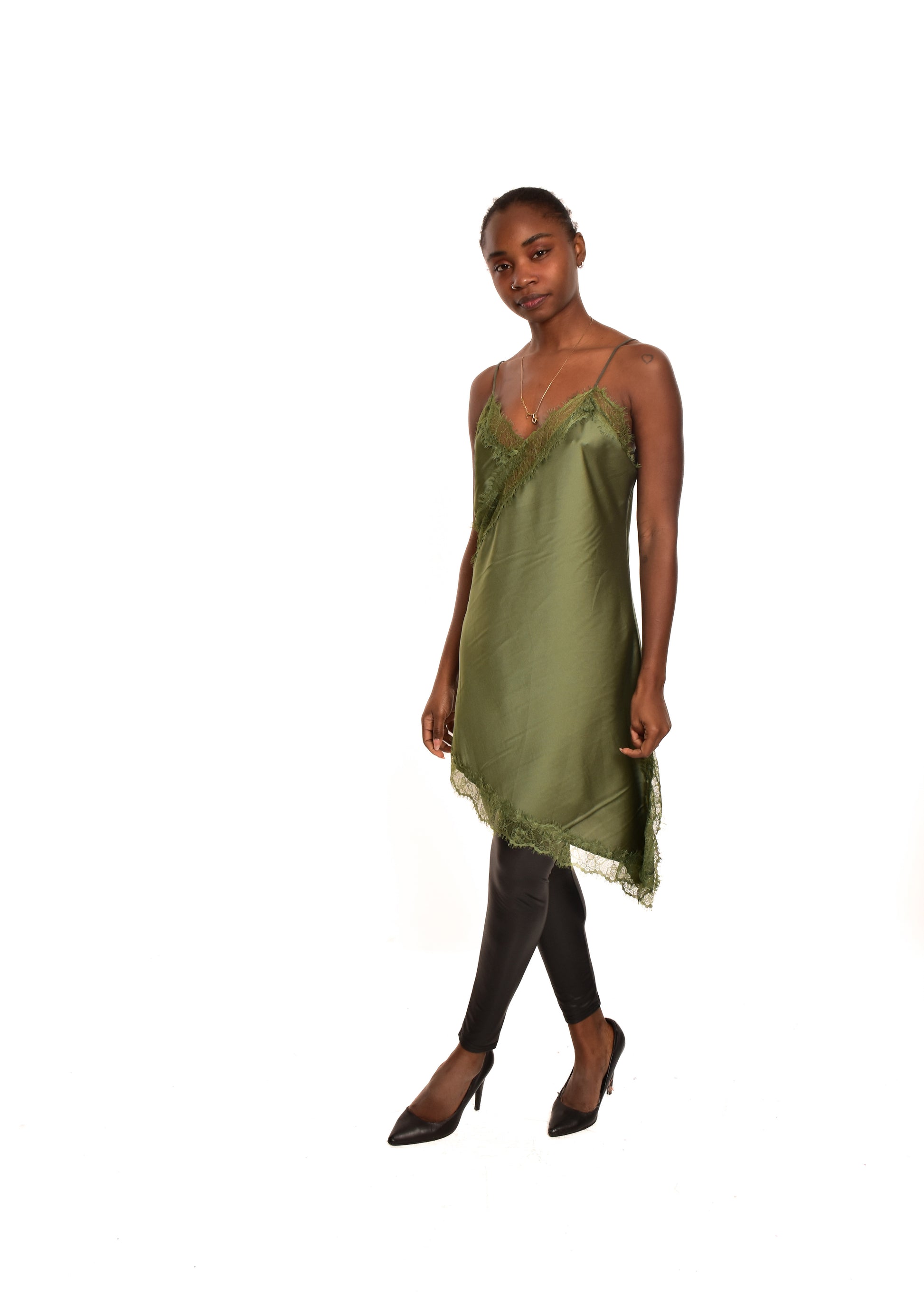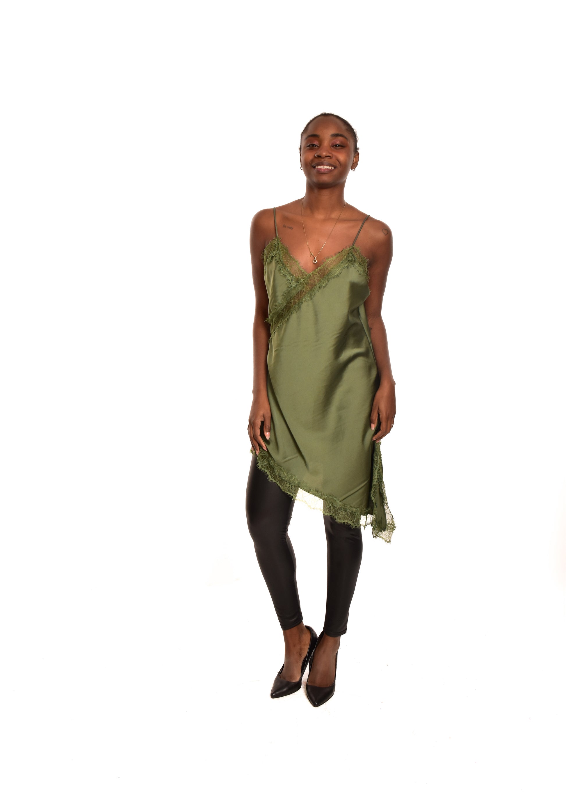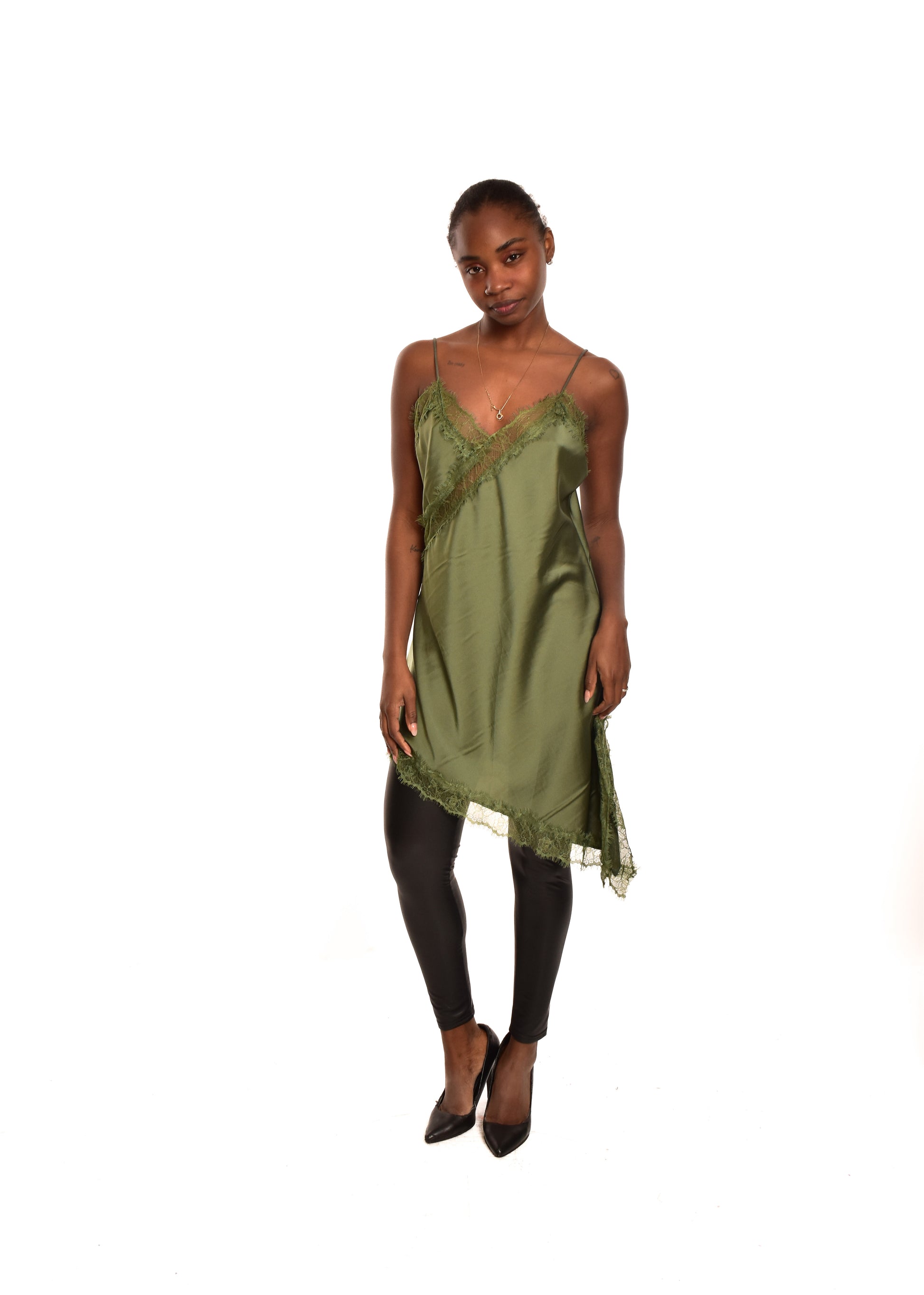 Vestido lencero con corte asimétrico. Esta prenda está disponible en talla única, en este caso es apto hasta una talla 40.