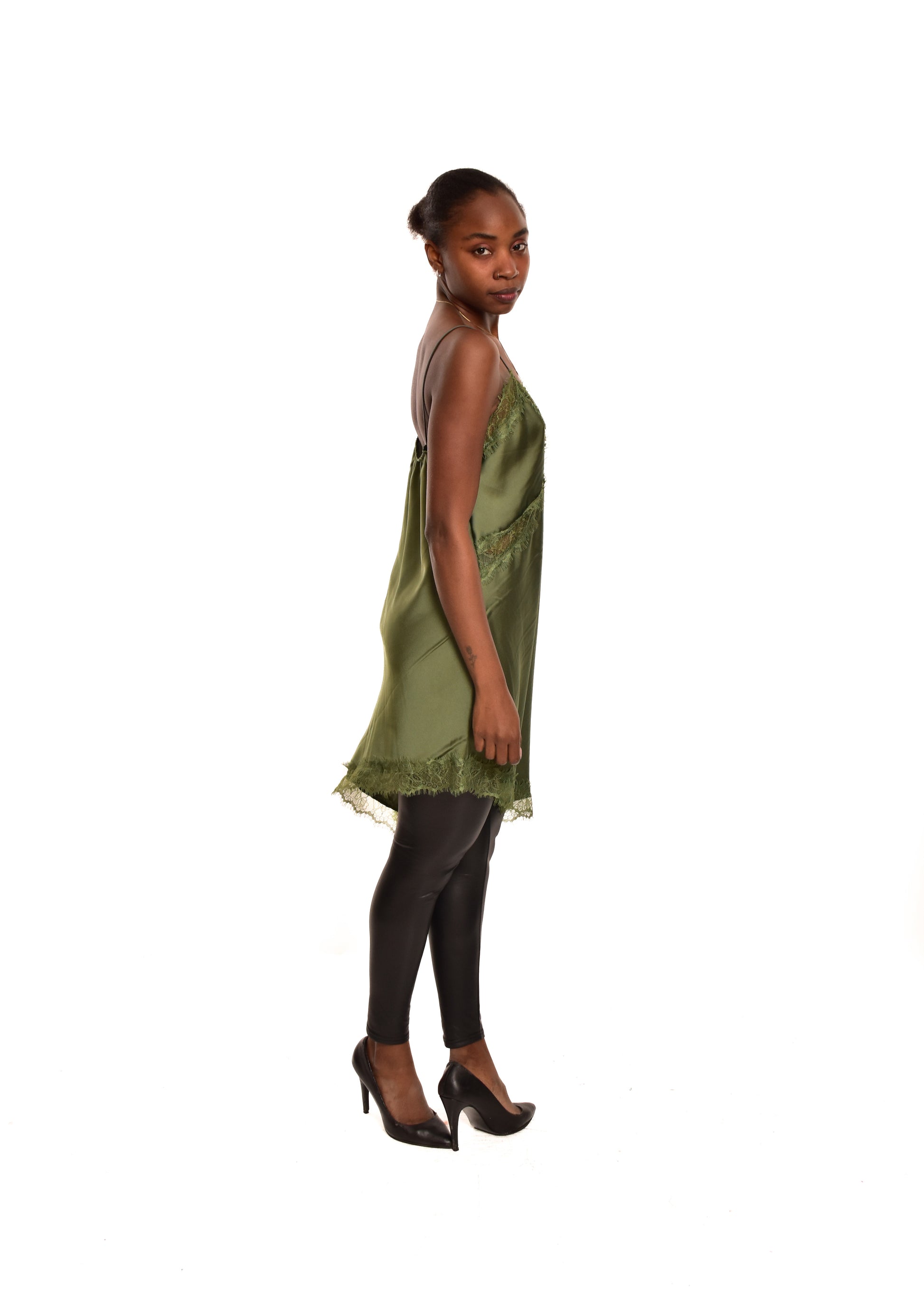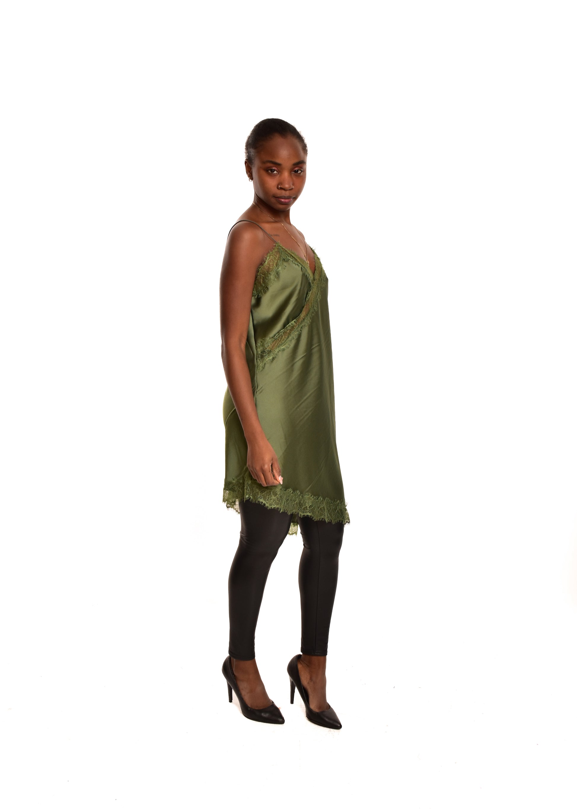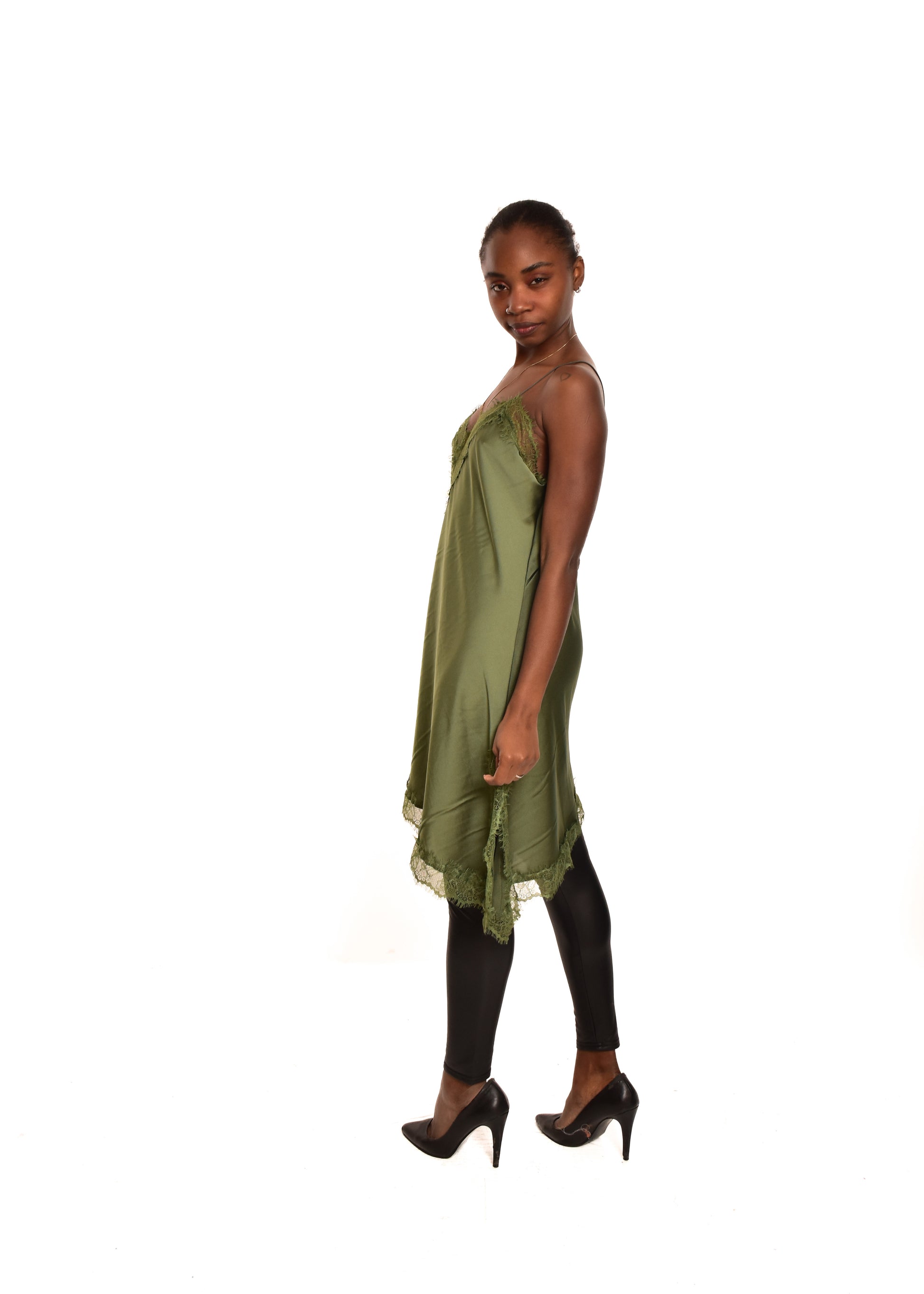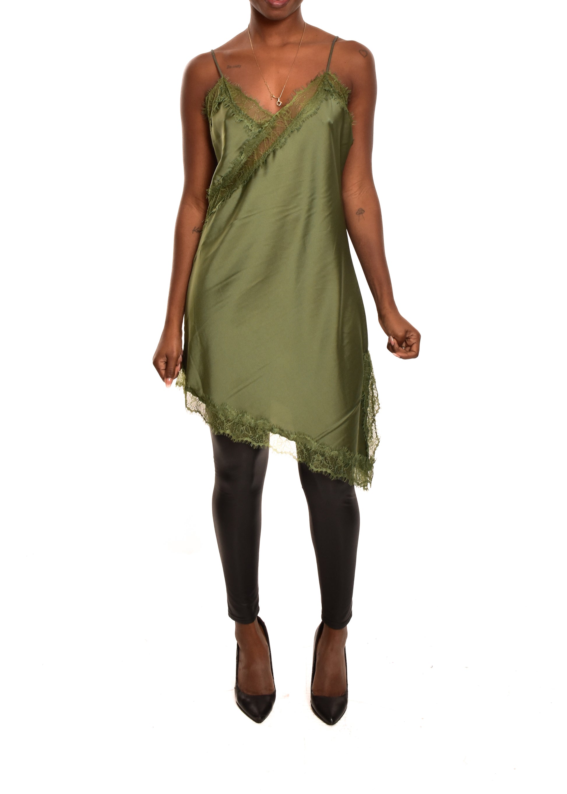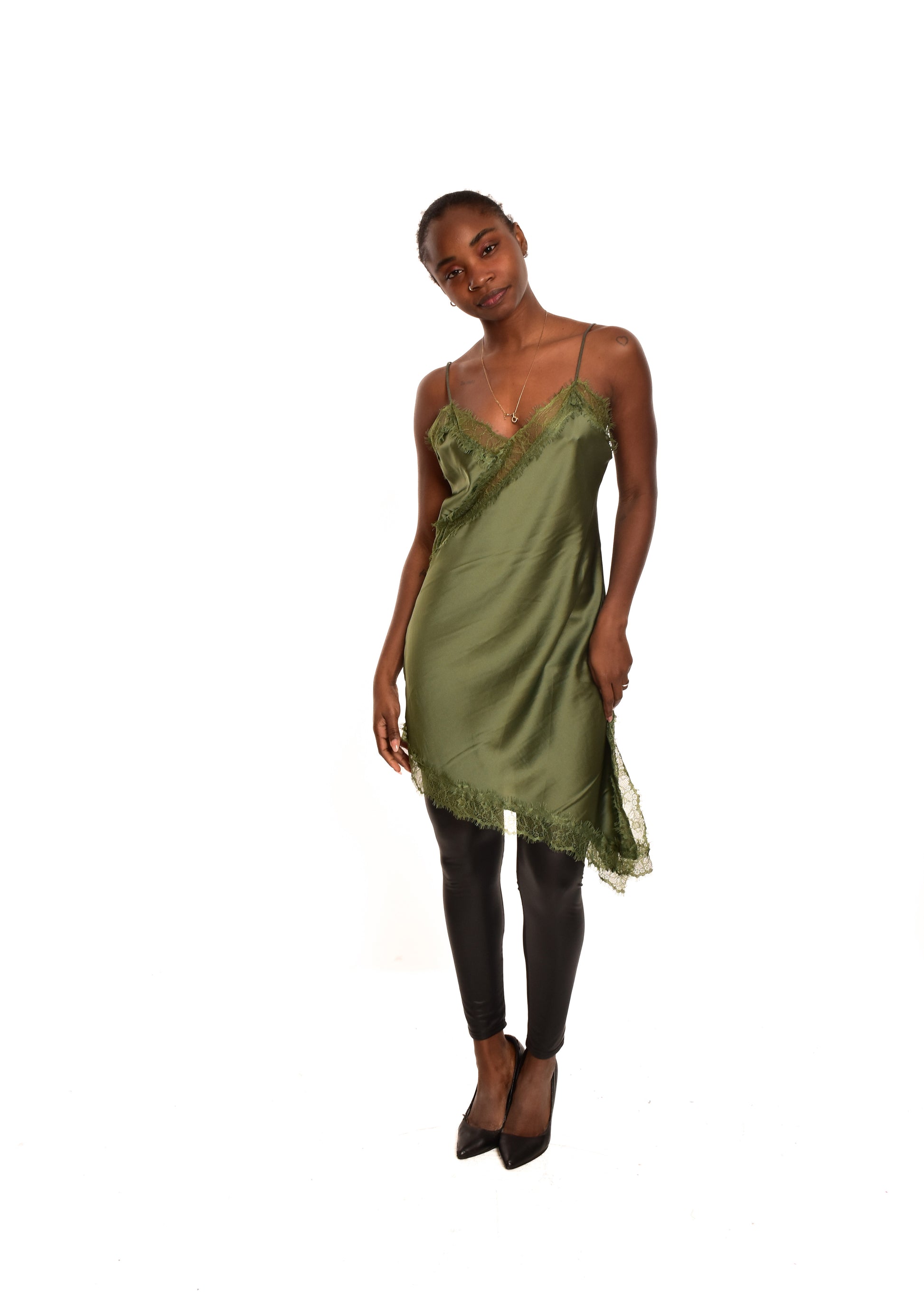 Vestido lencero con corte asimétrico. Esta prenda está disponible en talla única, en este caso es apto hasta una talla 40.