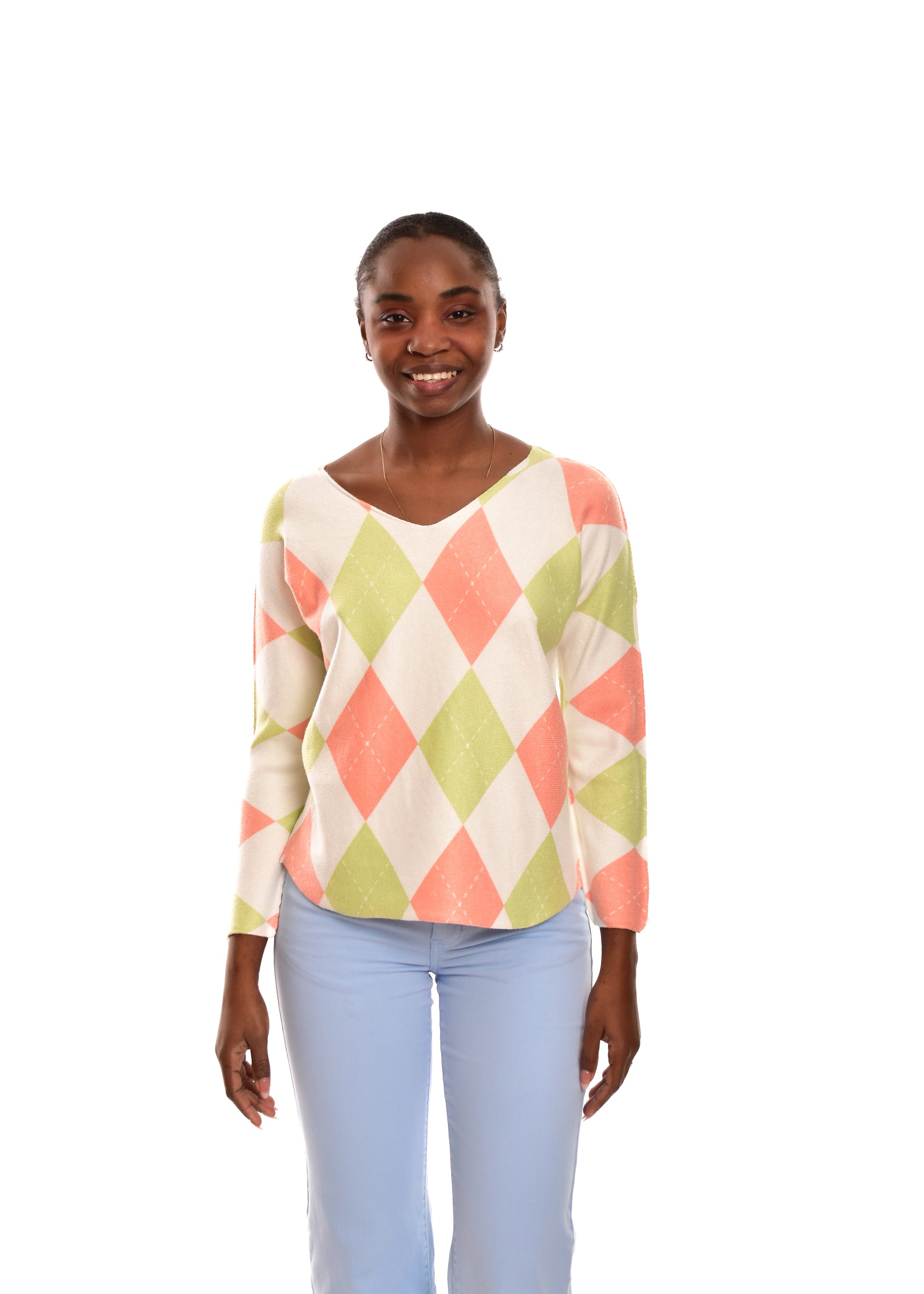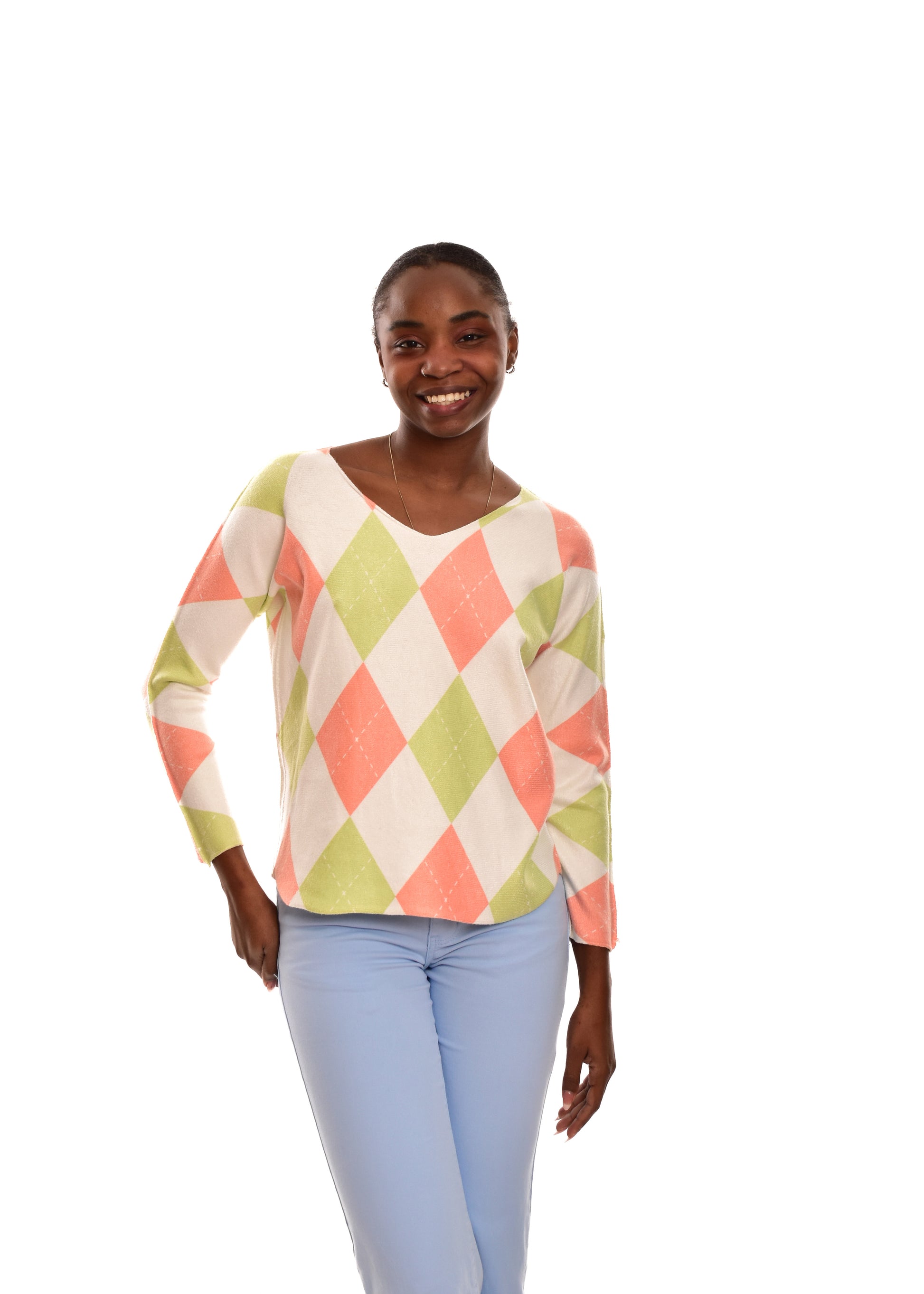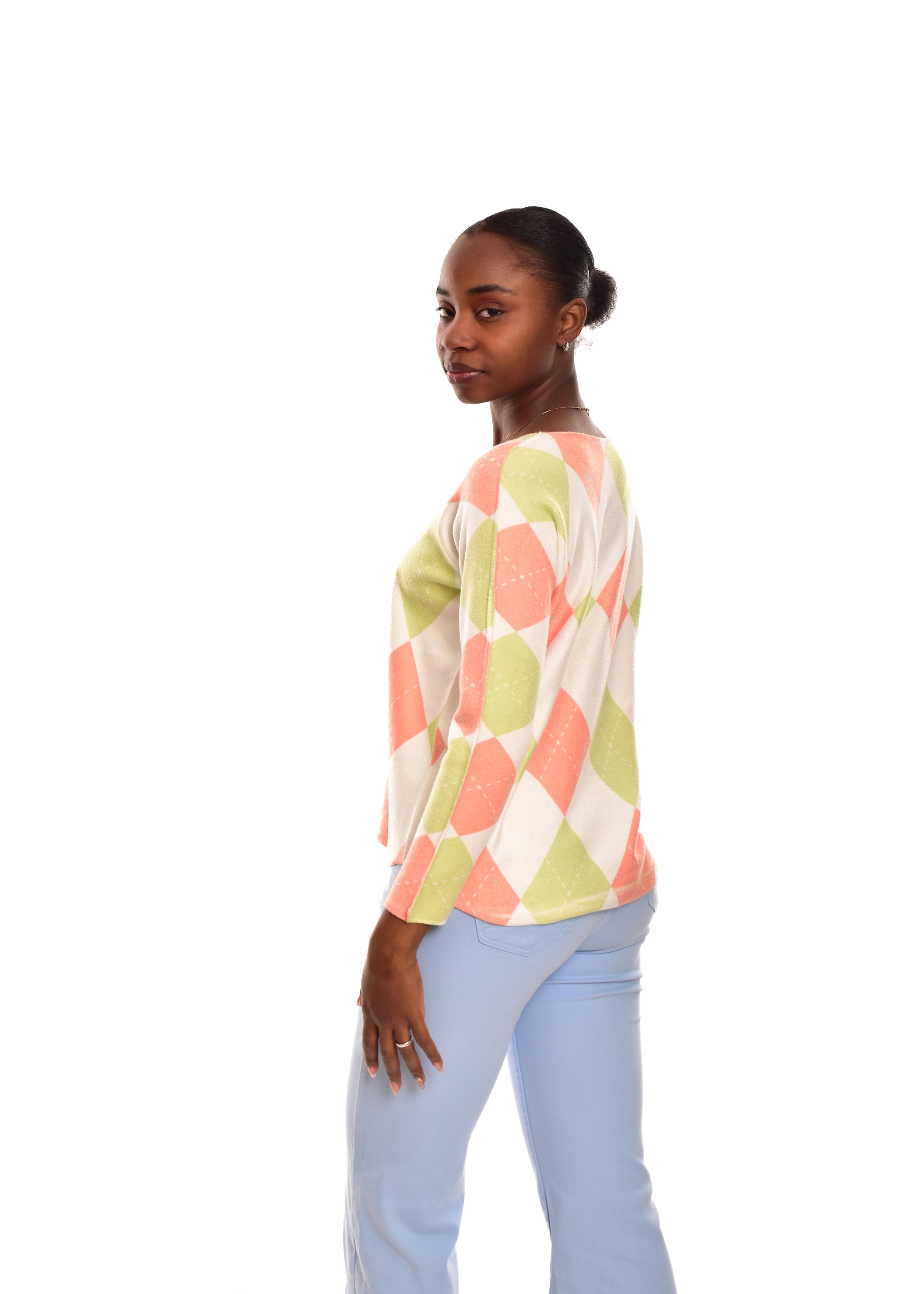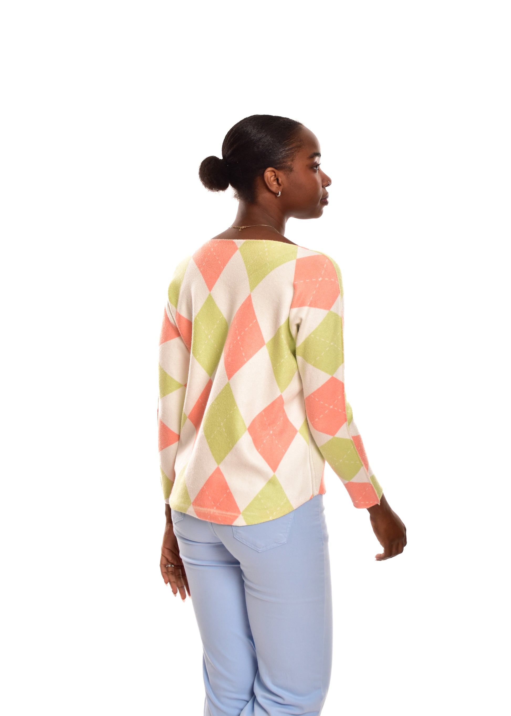 Jersey de punto intermedio con forma de rombos. Tejido súper suave. Esta prenda está disponible en talla única, en este caso es apto hasta una talla 42.