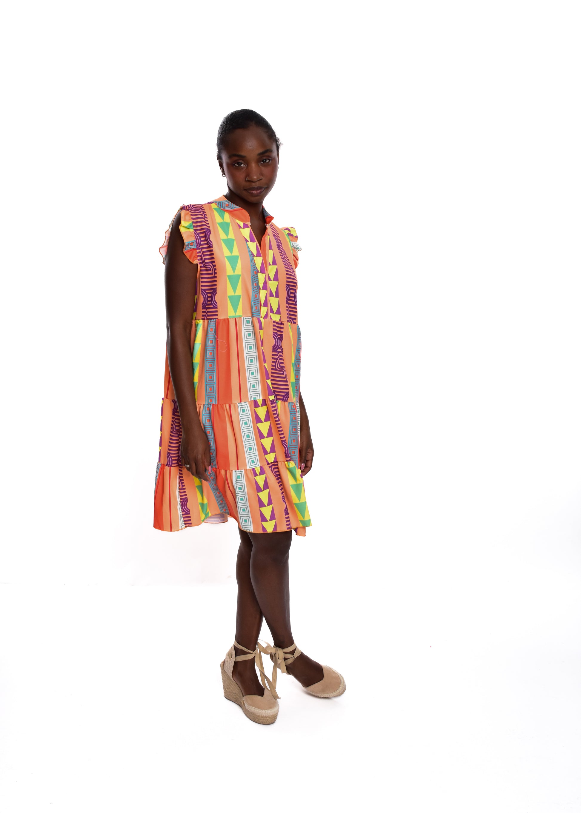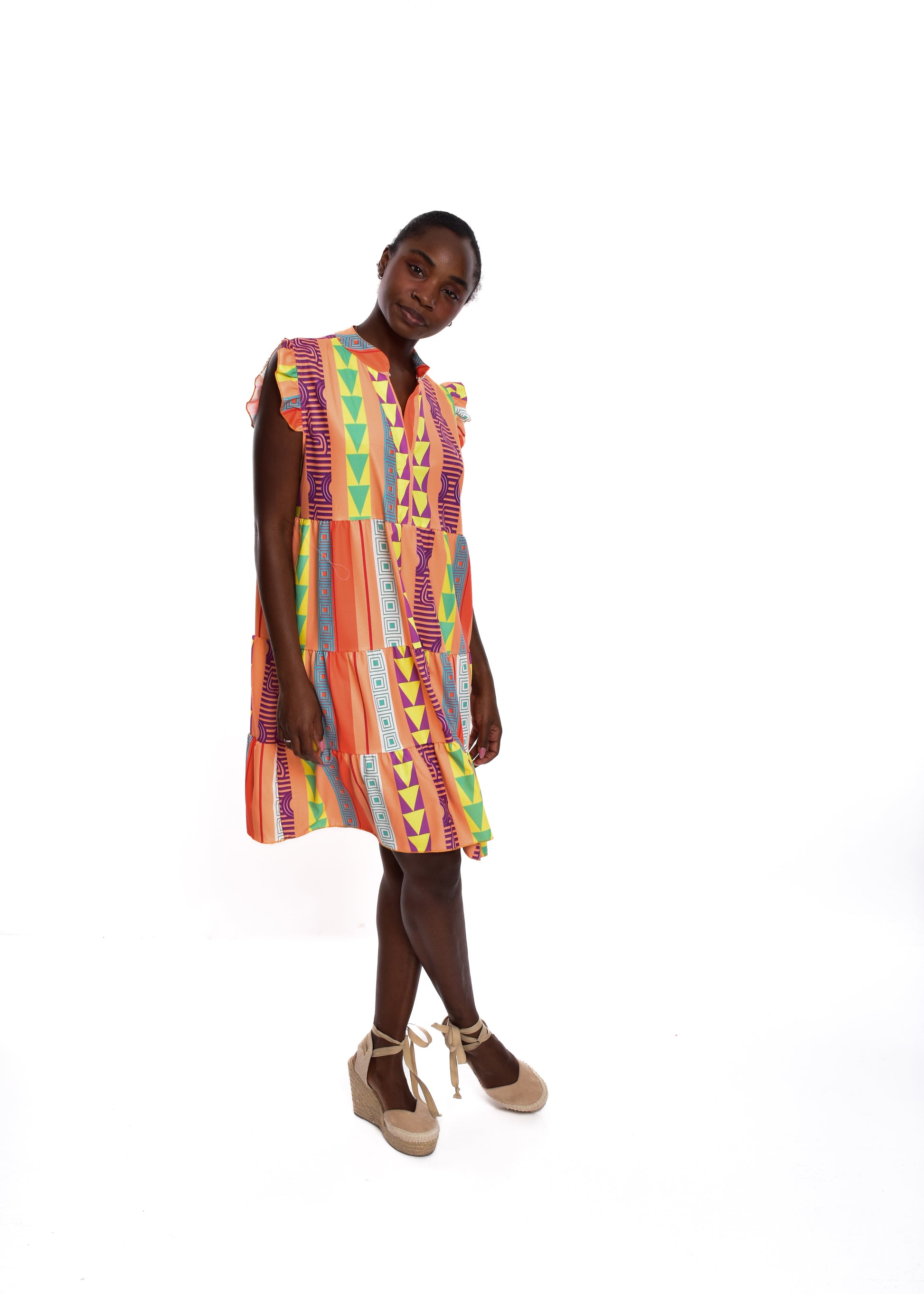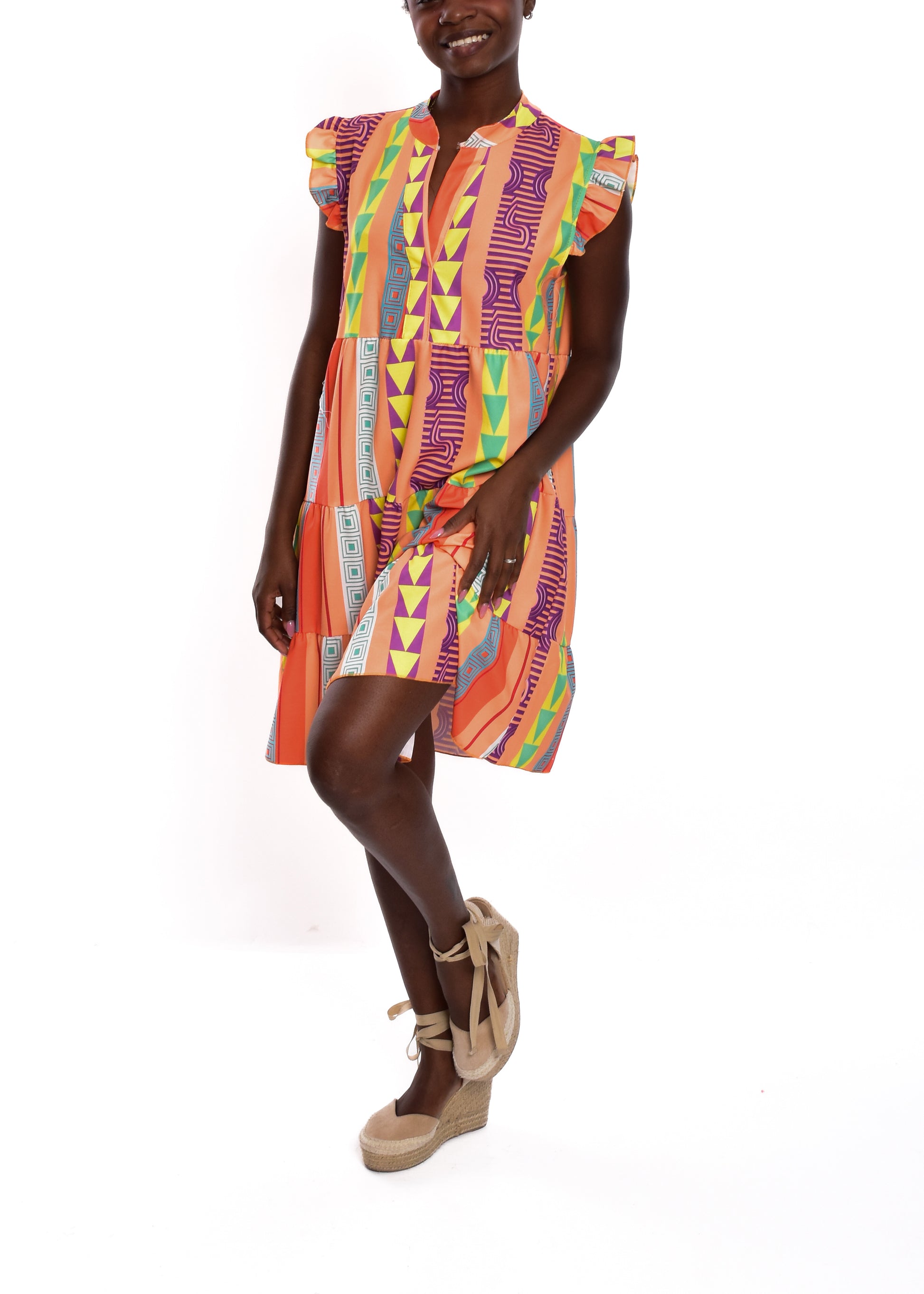 Vestido fluído con estampado étnico multicolor. Este modelo está disponible en talla única. En este caso es apto de una 38 a una 44.