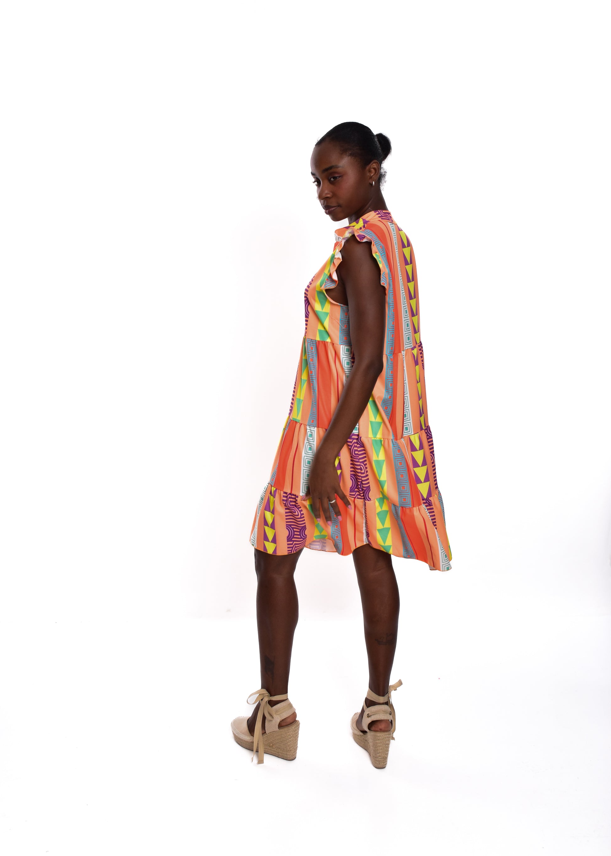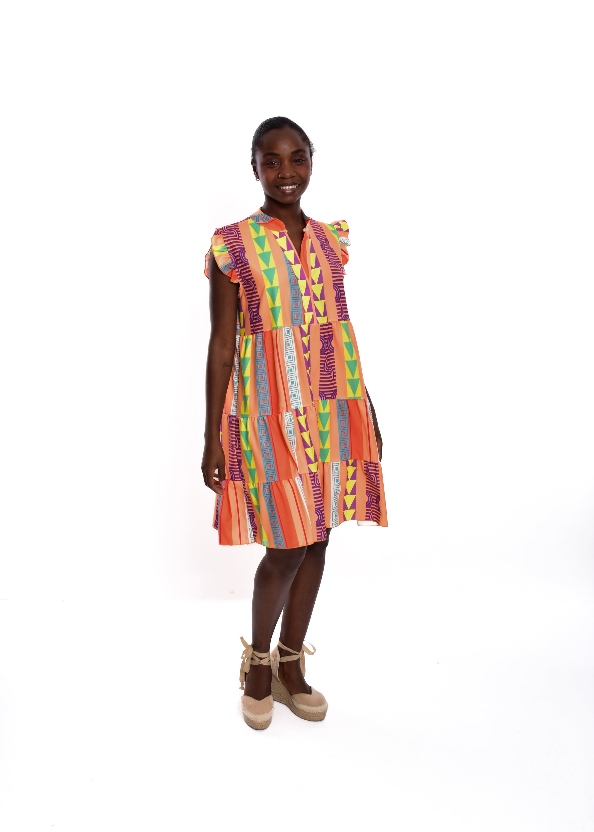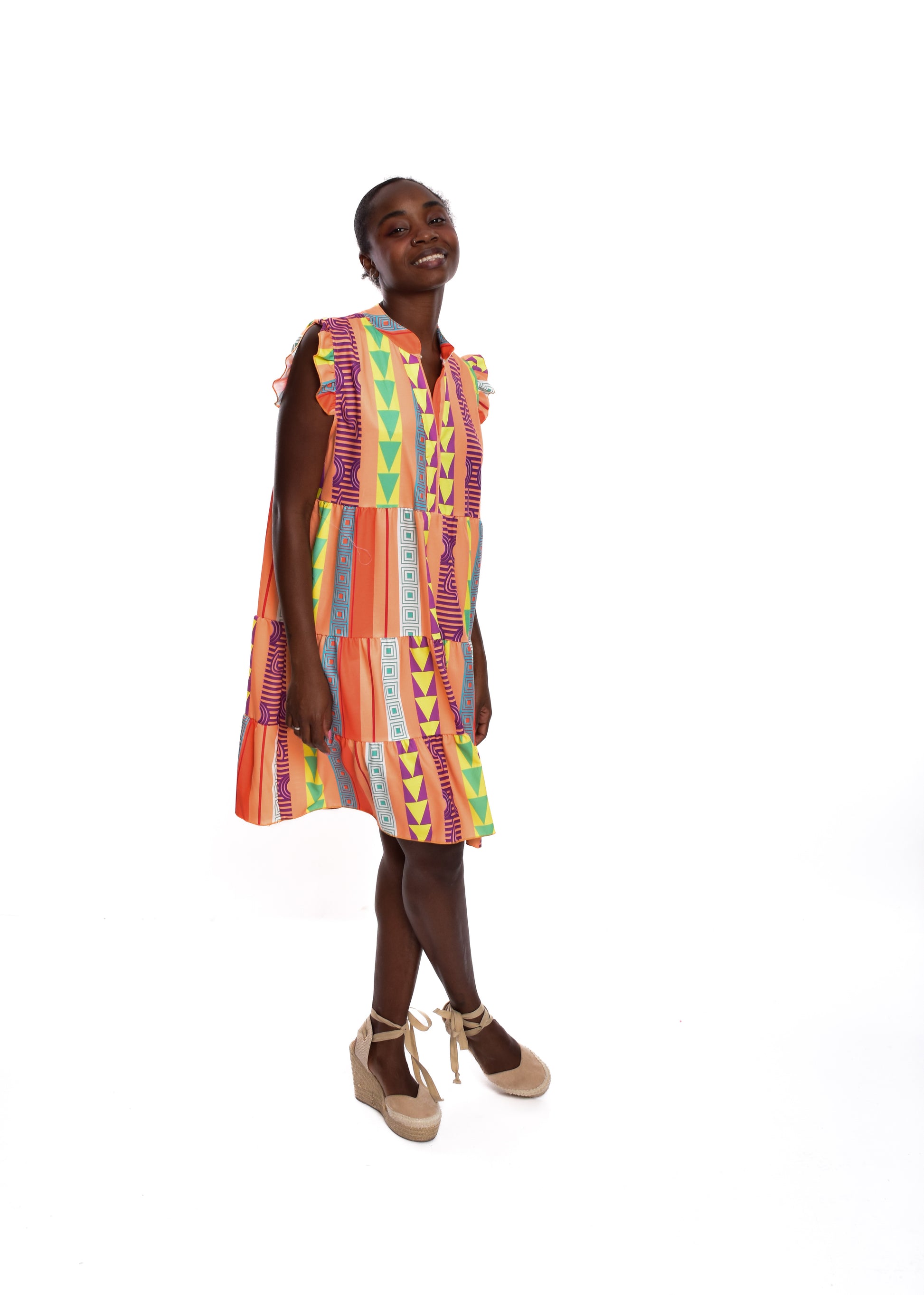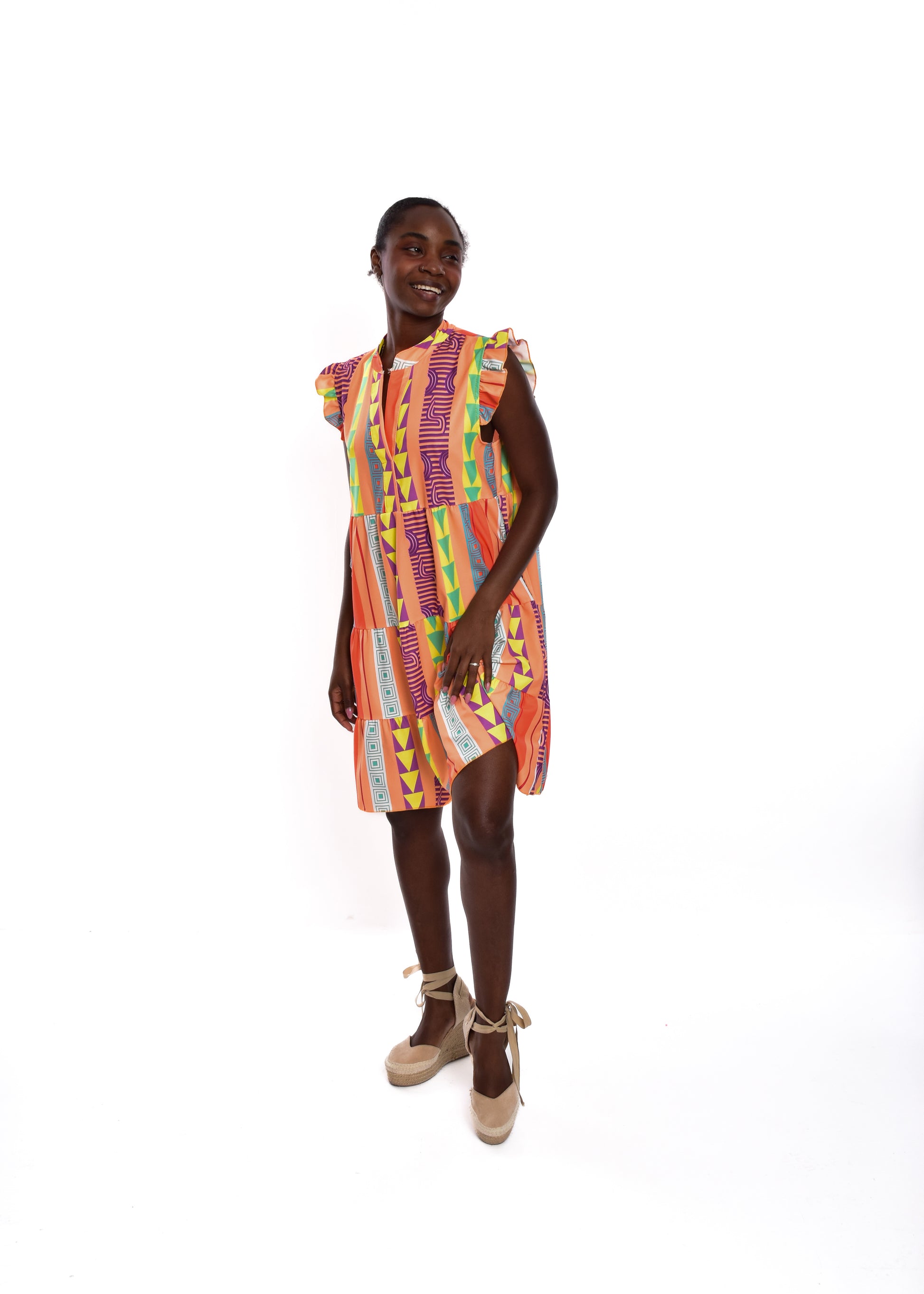 Vestido fluído con estampado étnico multicolor. Este modelo está disponible en talla única. En este caso es apto de una 38 a una 44.