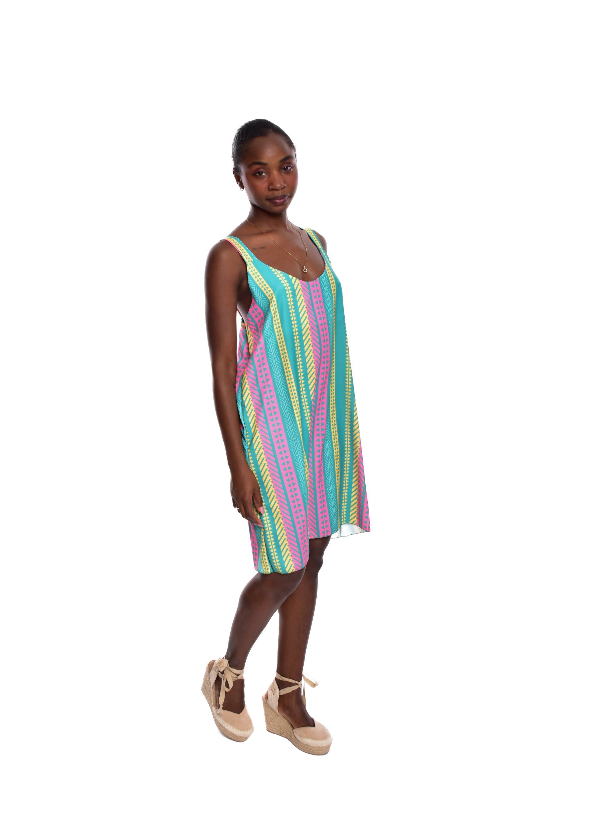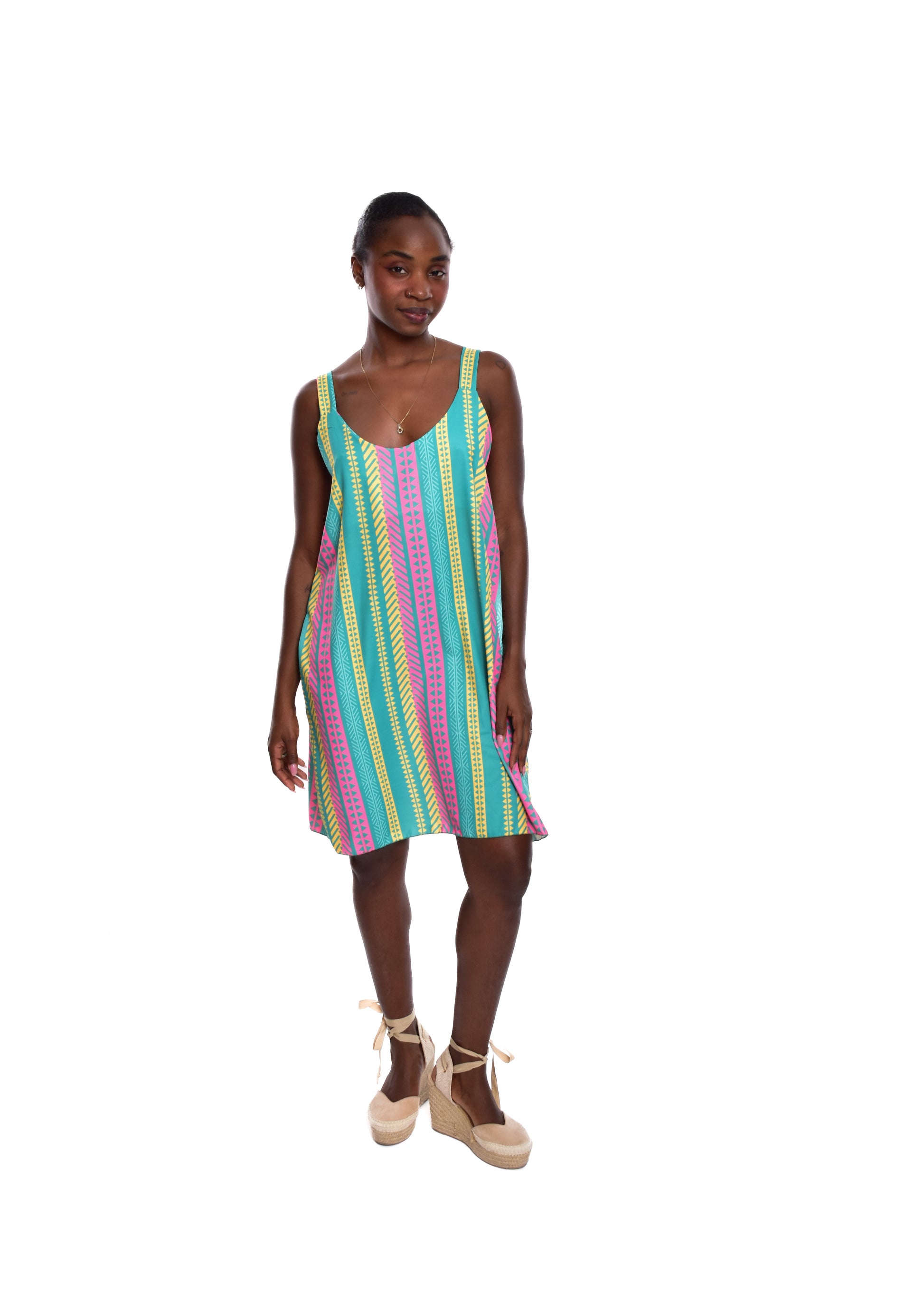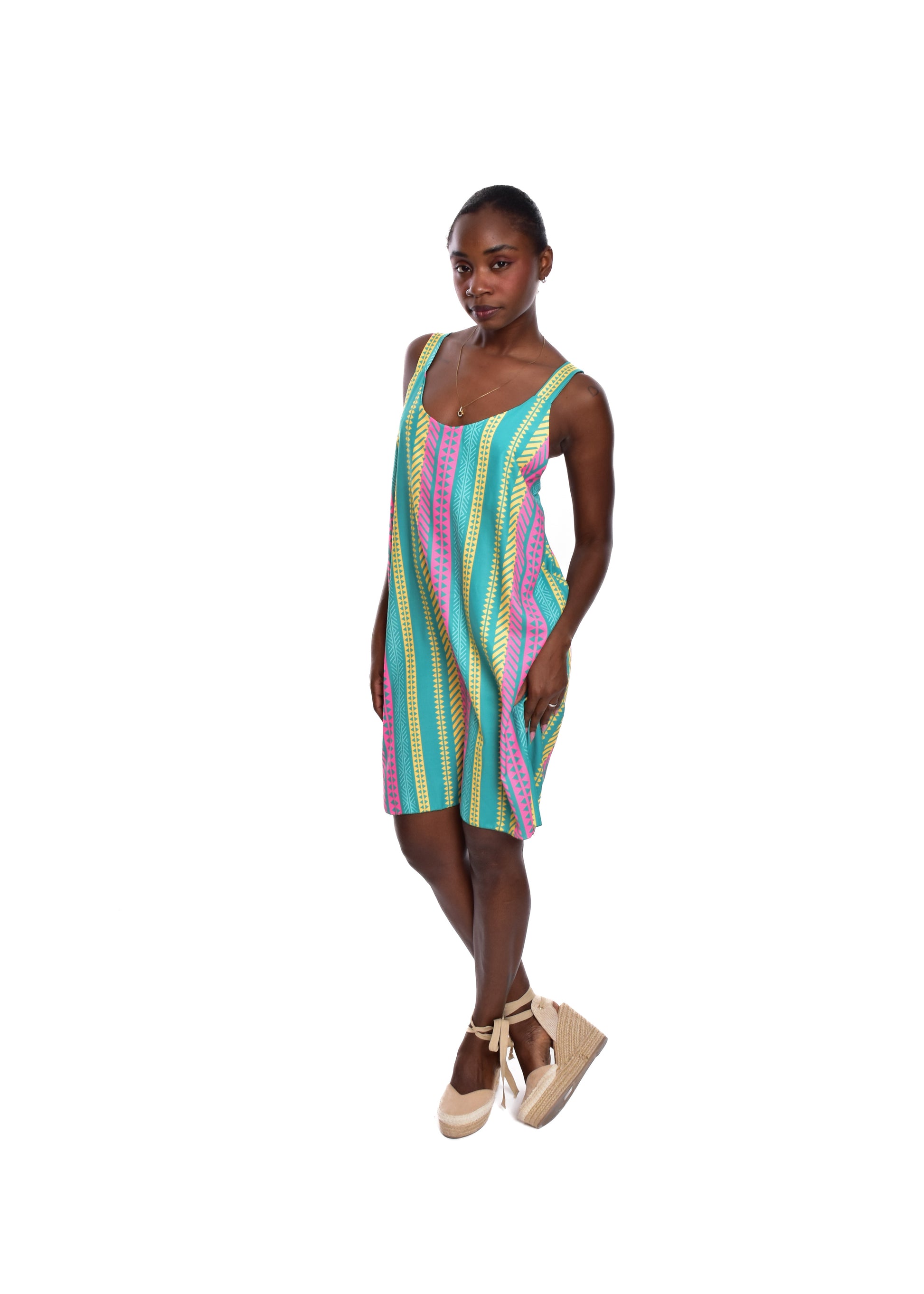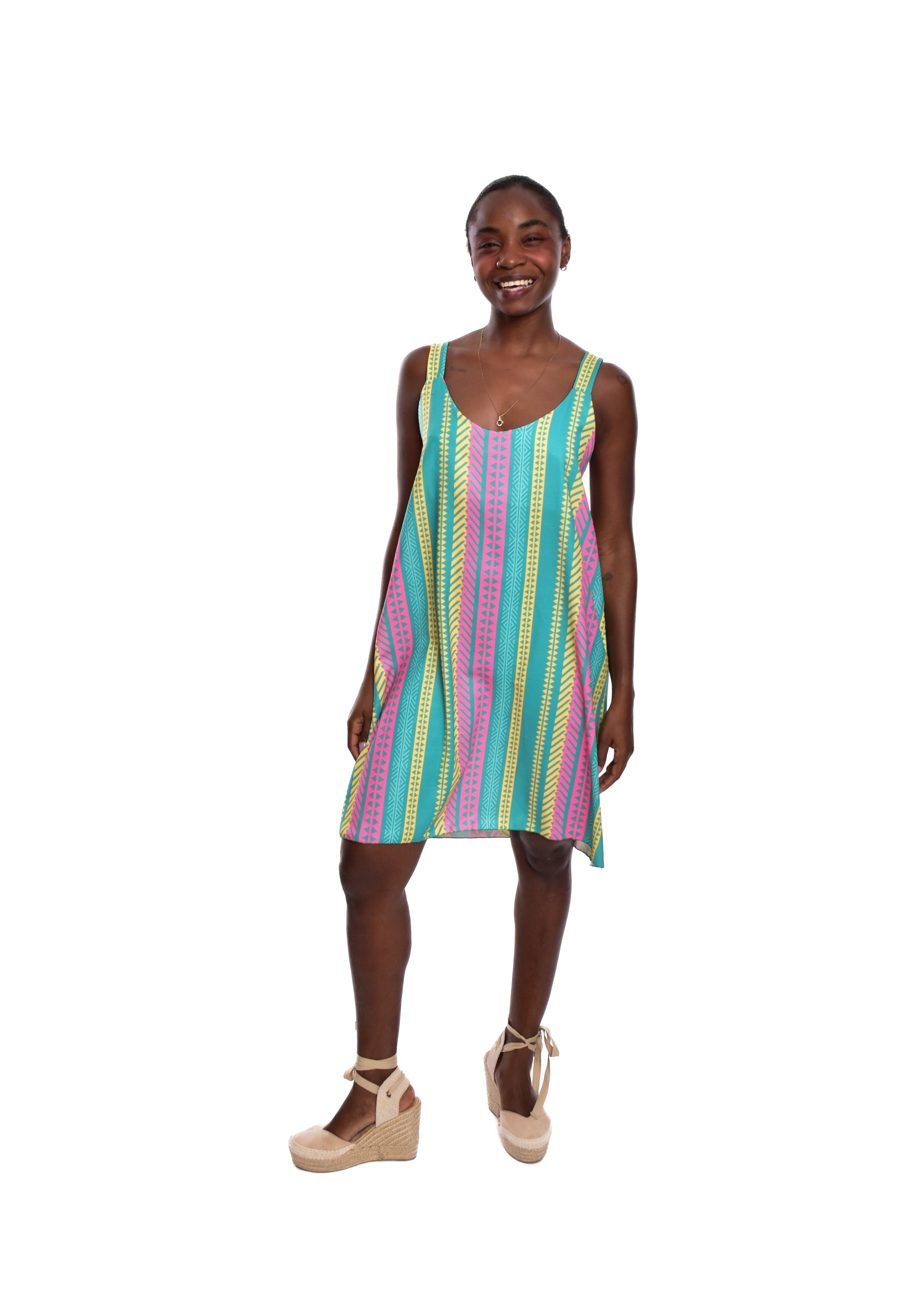 Vestido fluído con tirante ancho. Estampado étnico. Este modelo está disponible en talla única. En este caso es apto de una 38 a una 42.