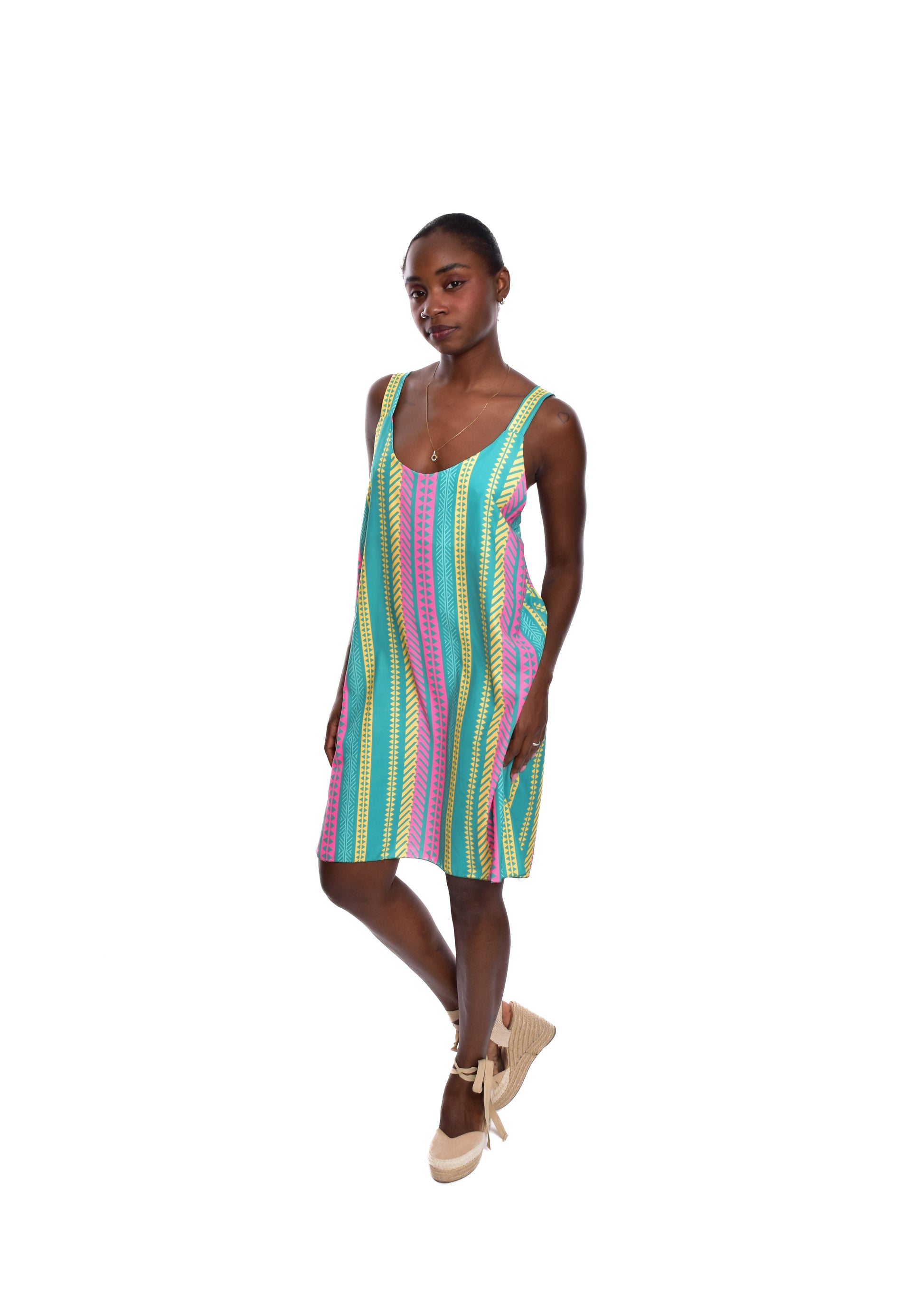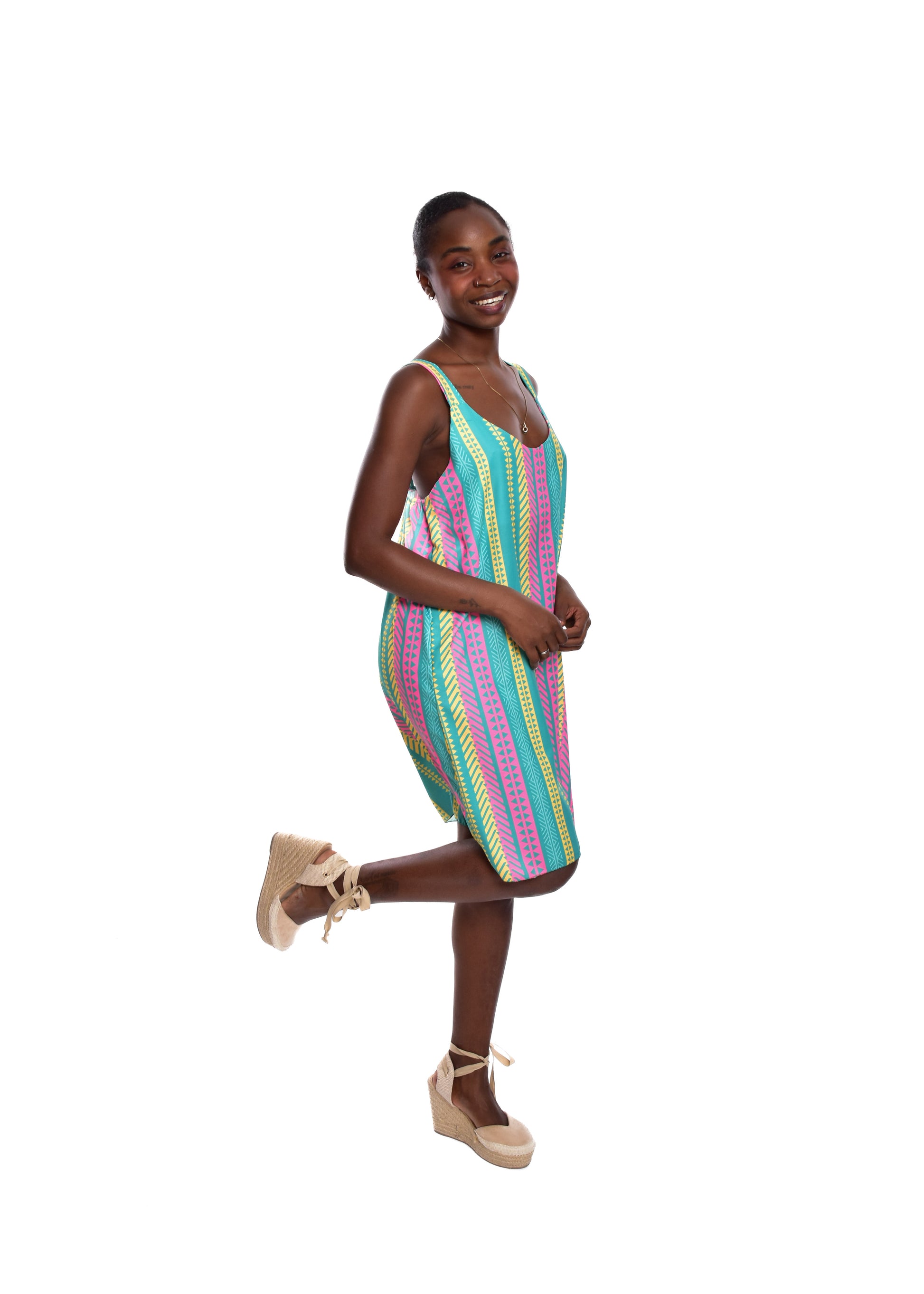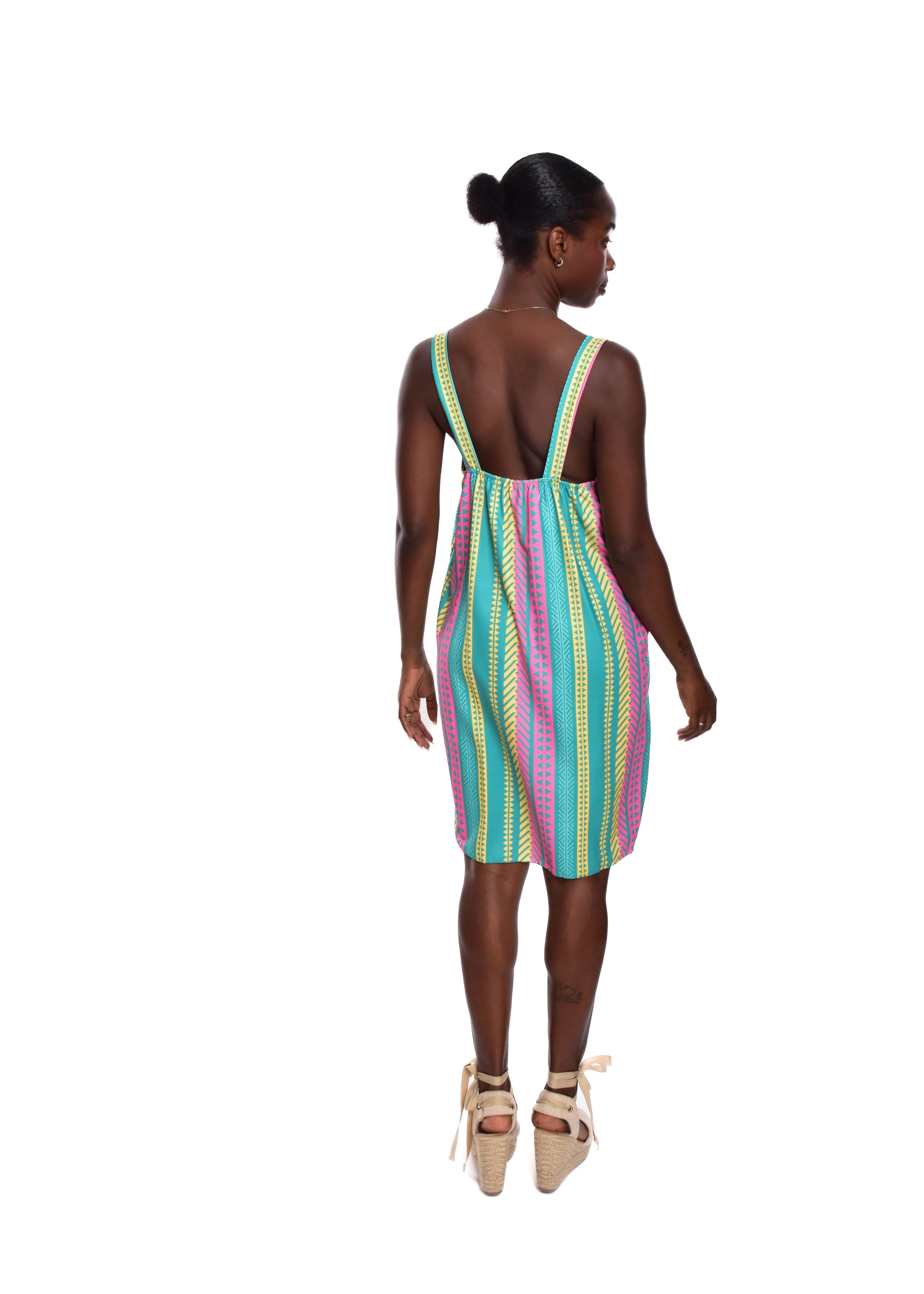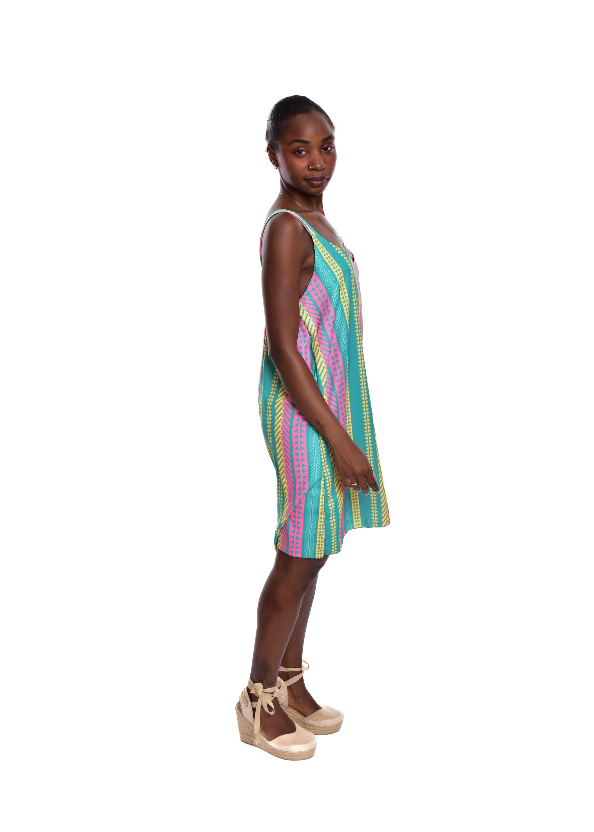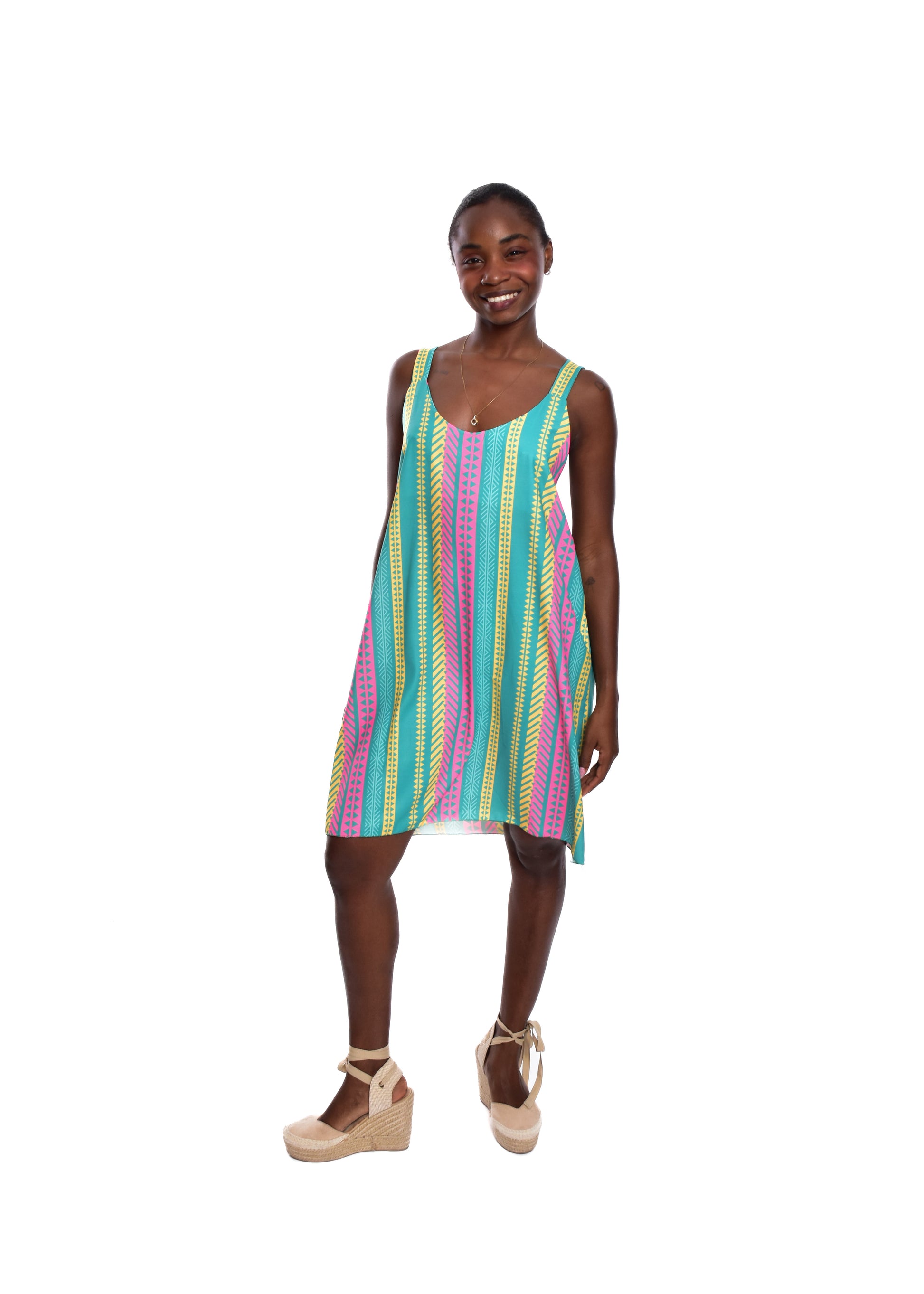 Vestido fluído con tirante ancho. Estampado étnico. Este modelo está disponible en talla única. En este caso es apto de una 38 a una 42.