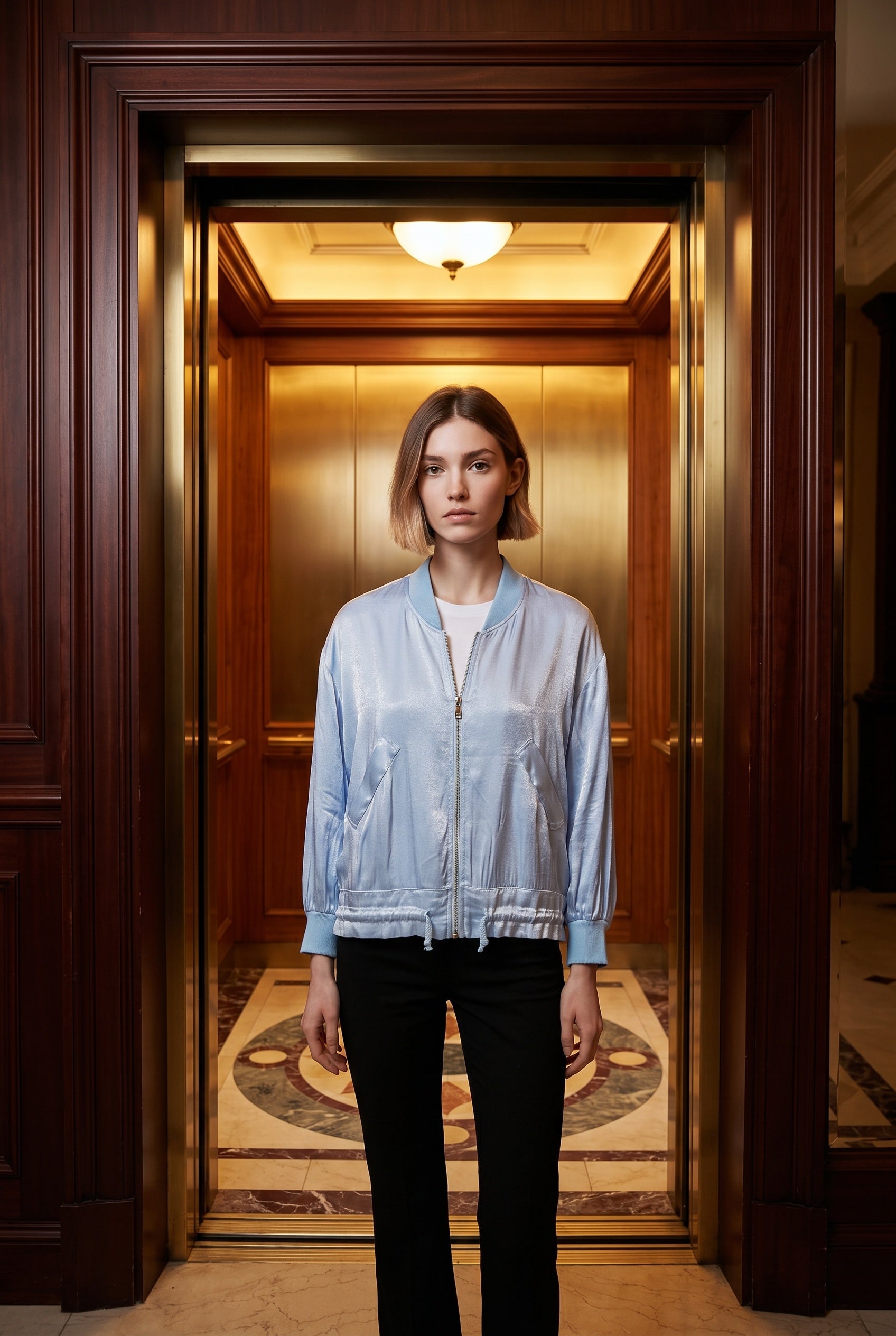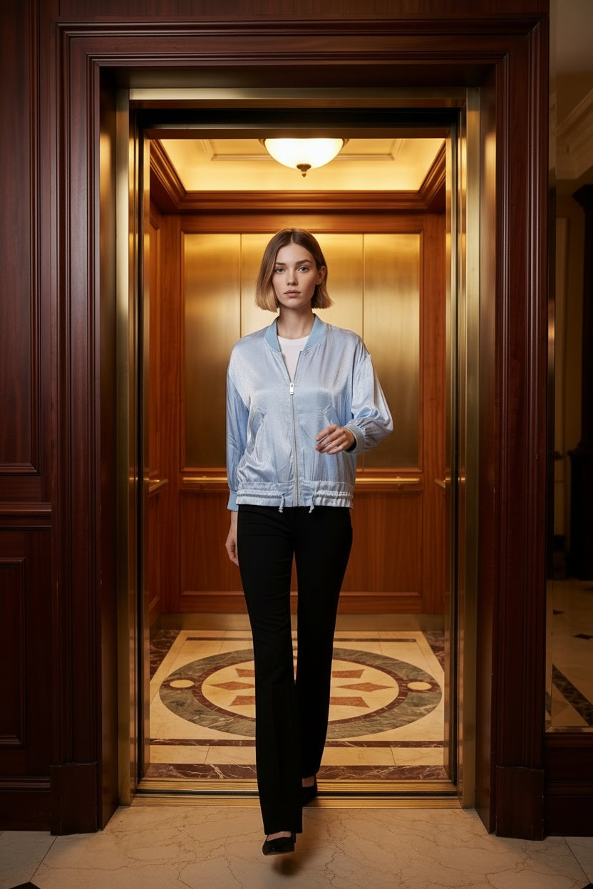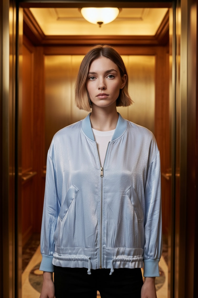 Jaqueta bomber estampada com elástico na parte inferior. Este modelo está disponível em tamanho único, neste caso é adequado do 38 ao 42.