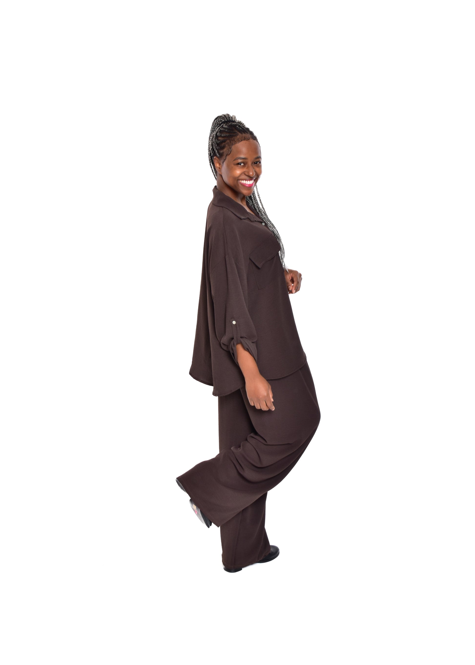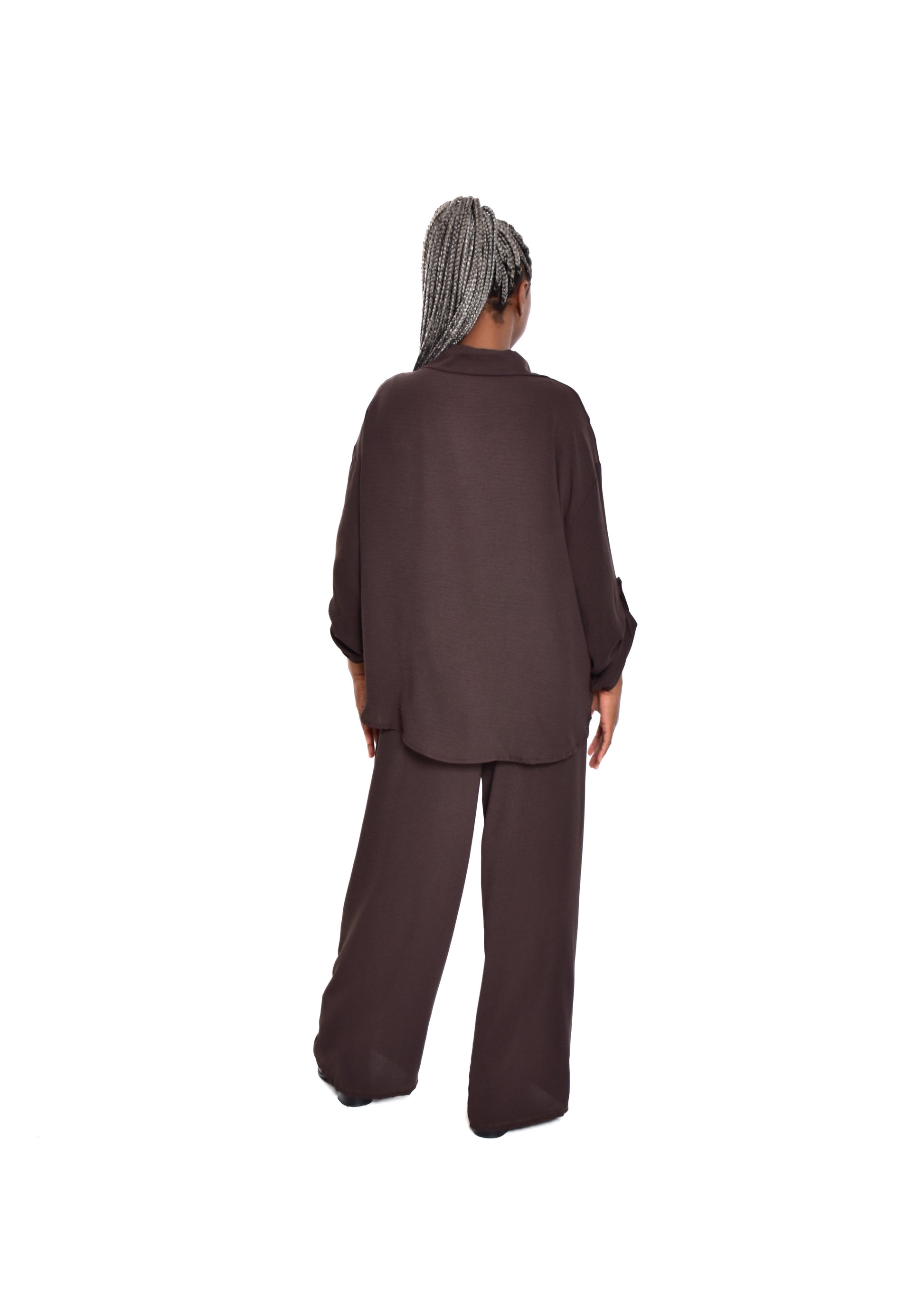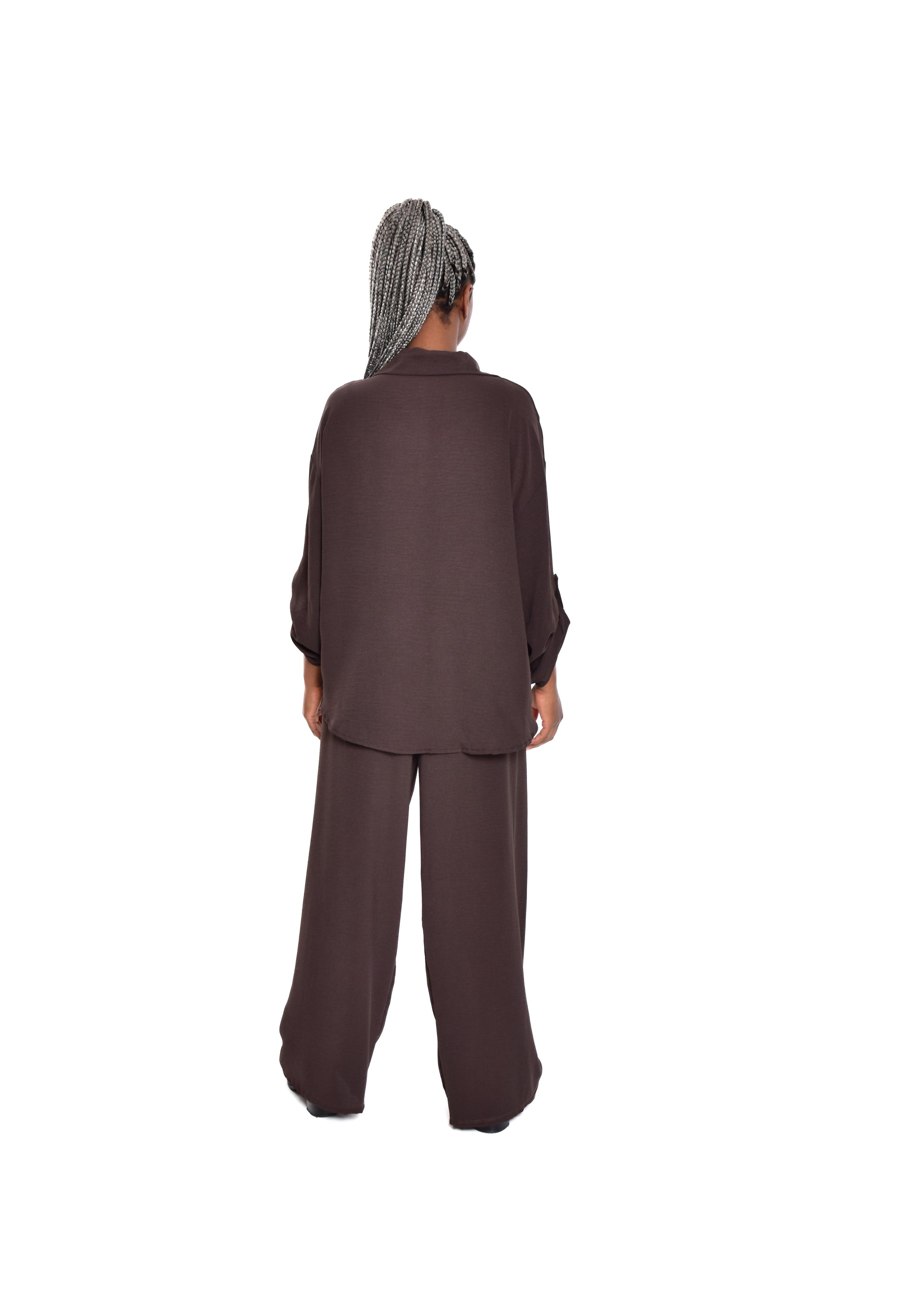 Conjunto compuesto por blusa fluída y pantalón fluído. Este modelo está disponible en Talla única, en este caso es apto hasta una talla 44.