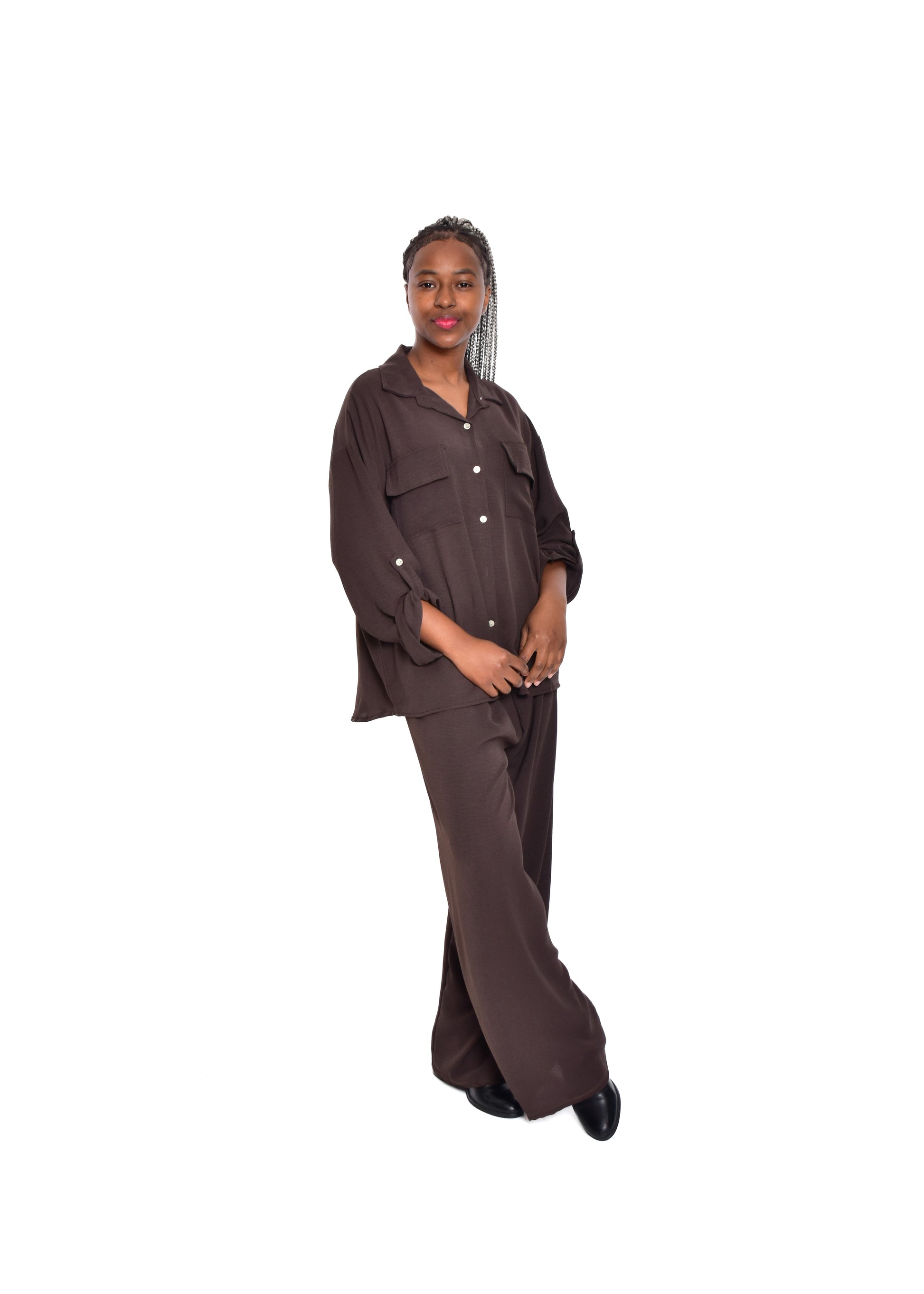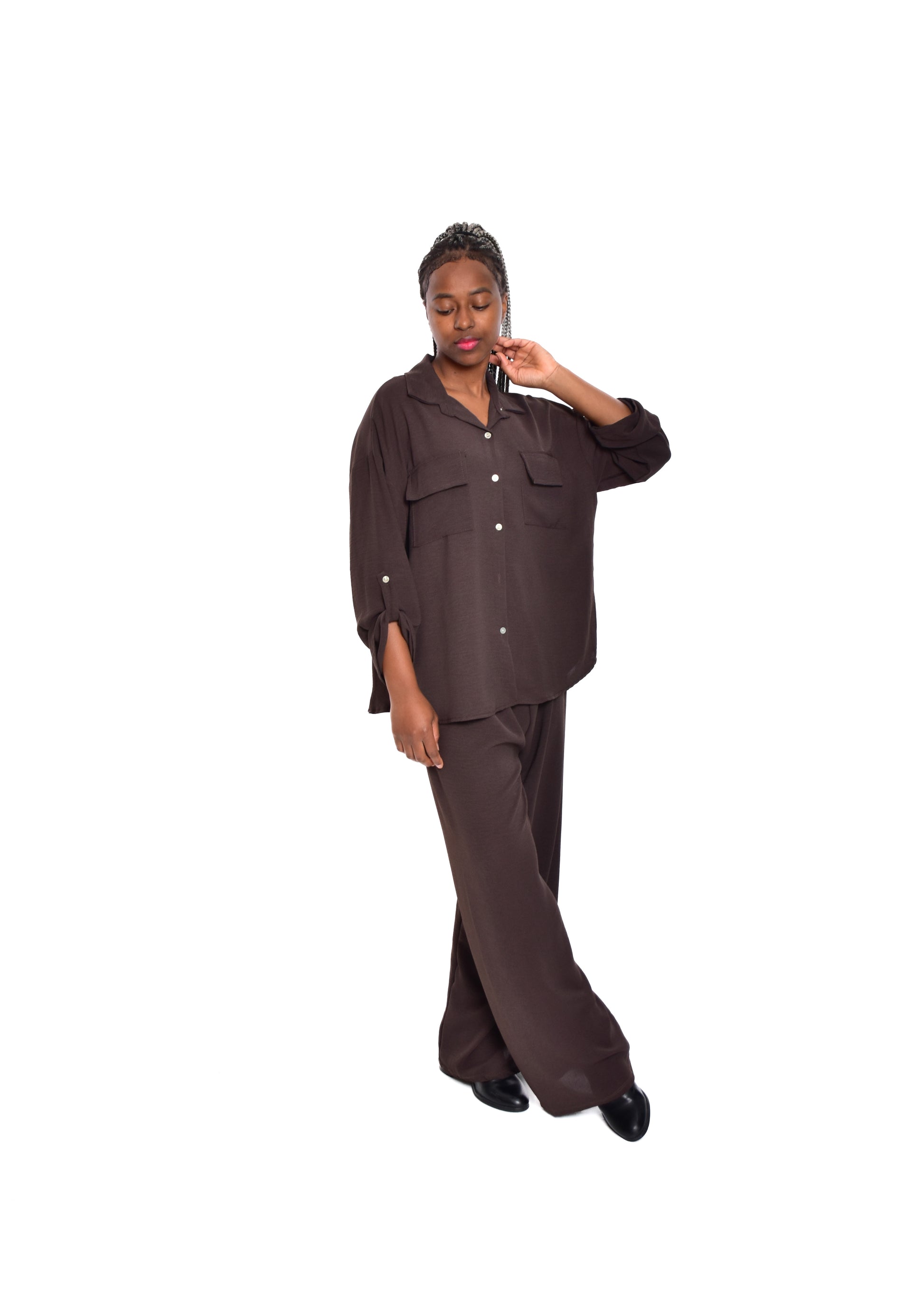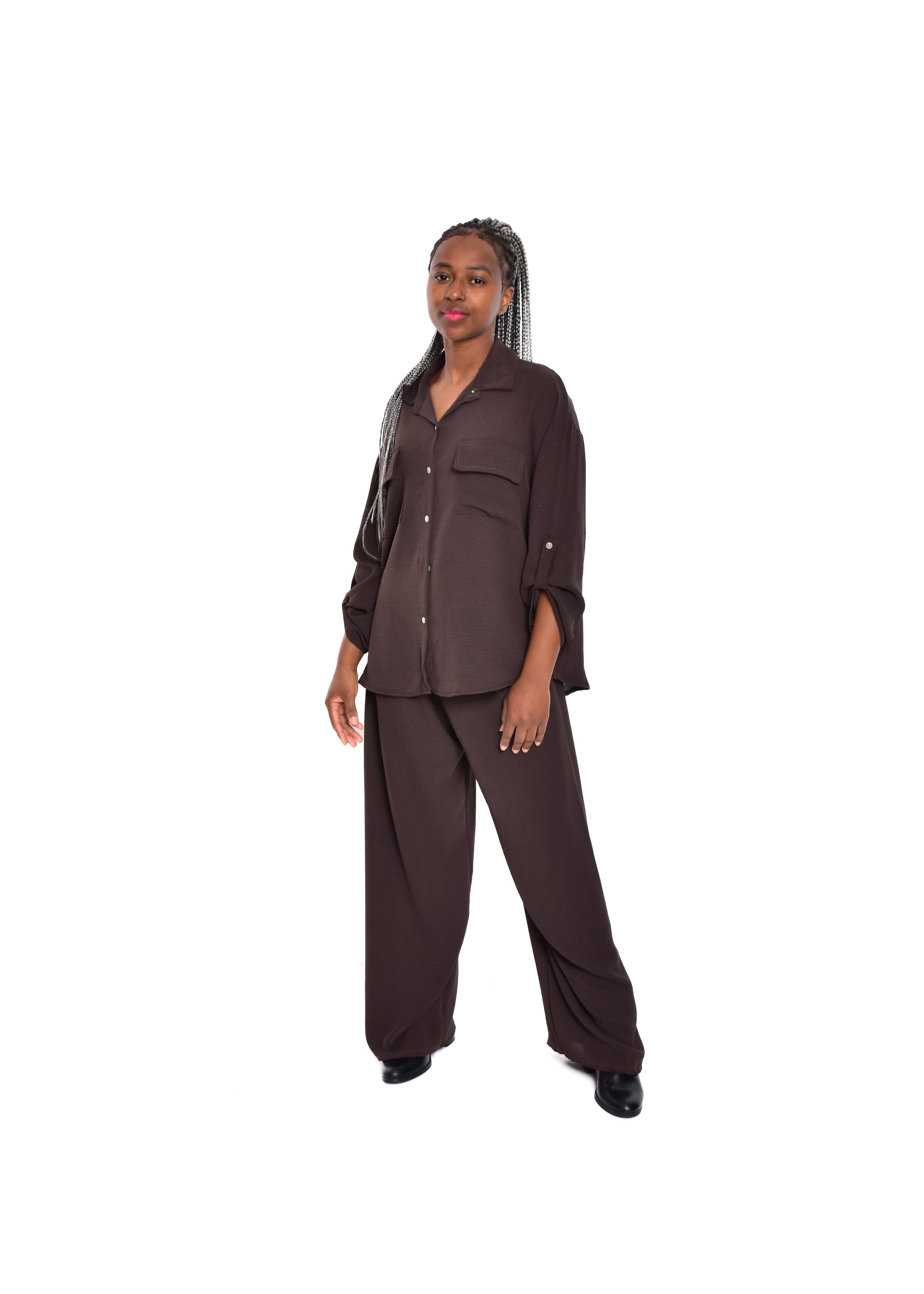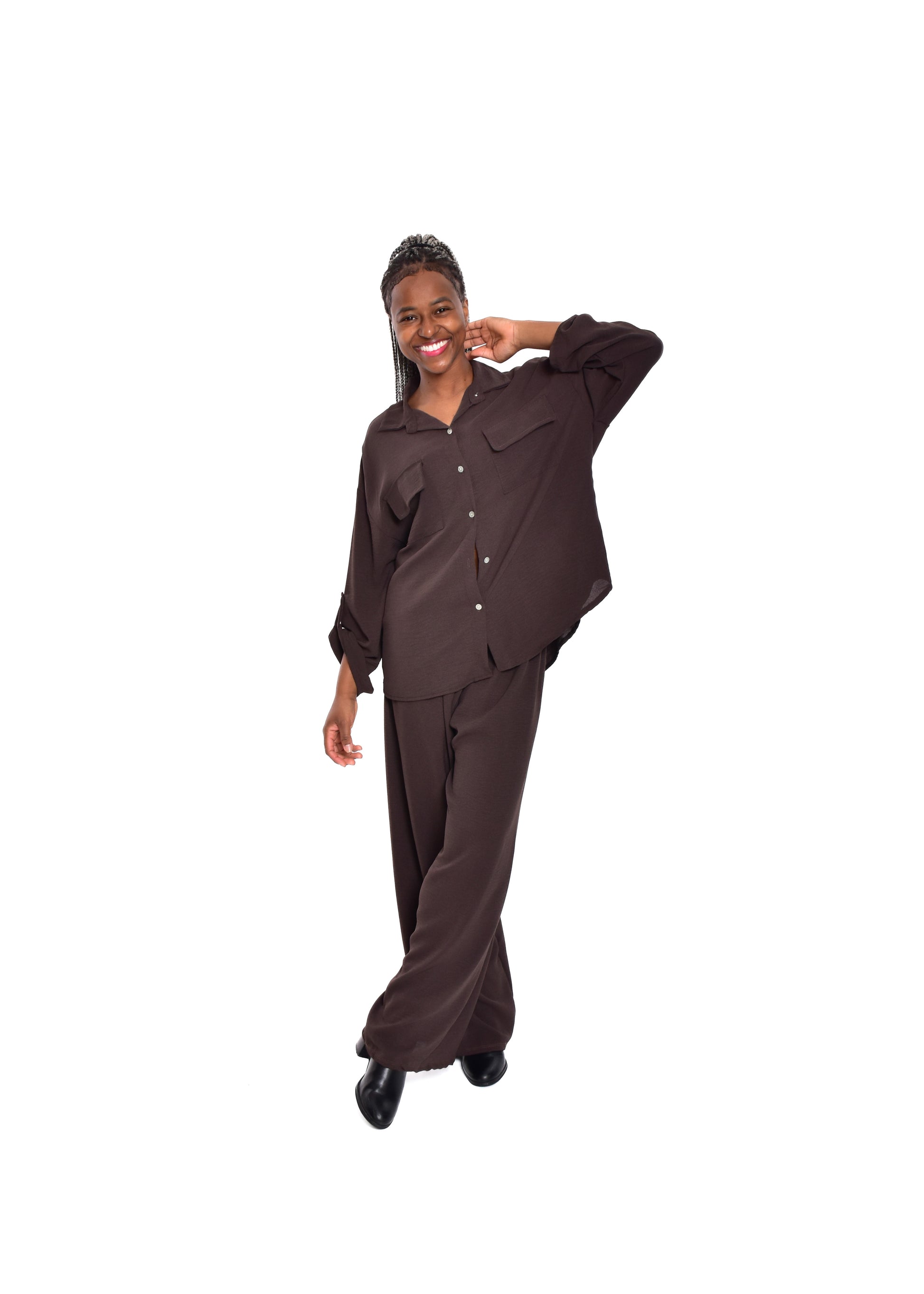 Conjunto compuesto por blusa fluída y pantalón fluído. Este modelo está disponible en Talla única, en este caso es apto hasta una talla 44.
